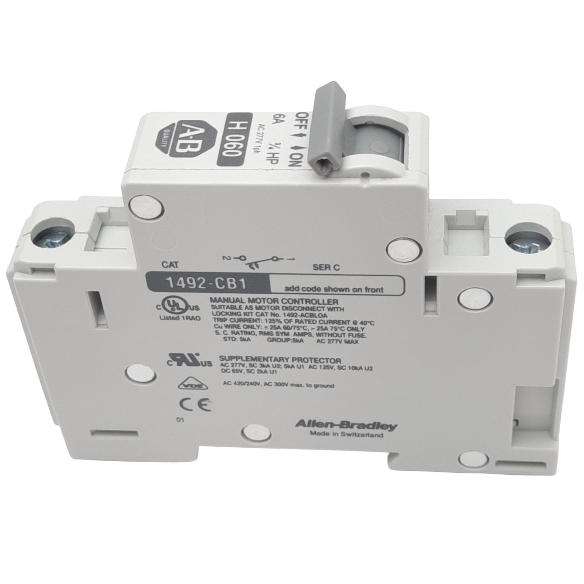 New Allen Bradley 1492-CB1H060 Circuit Breaker, 1-Pole, 6A, 277VAC Max, DIN Rail