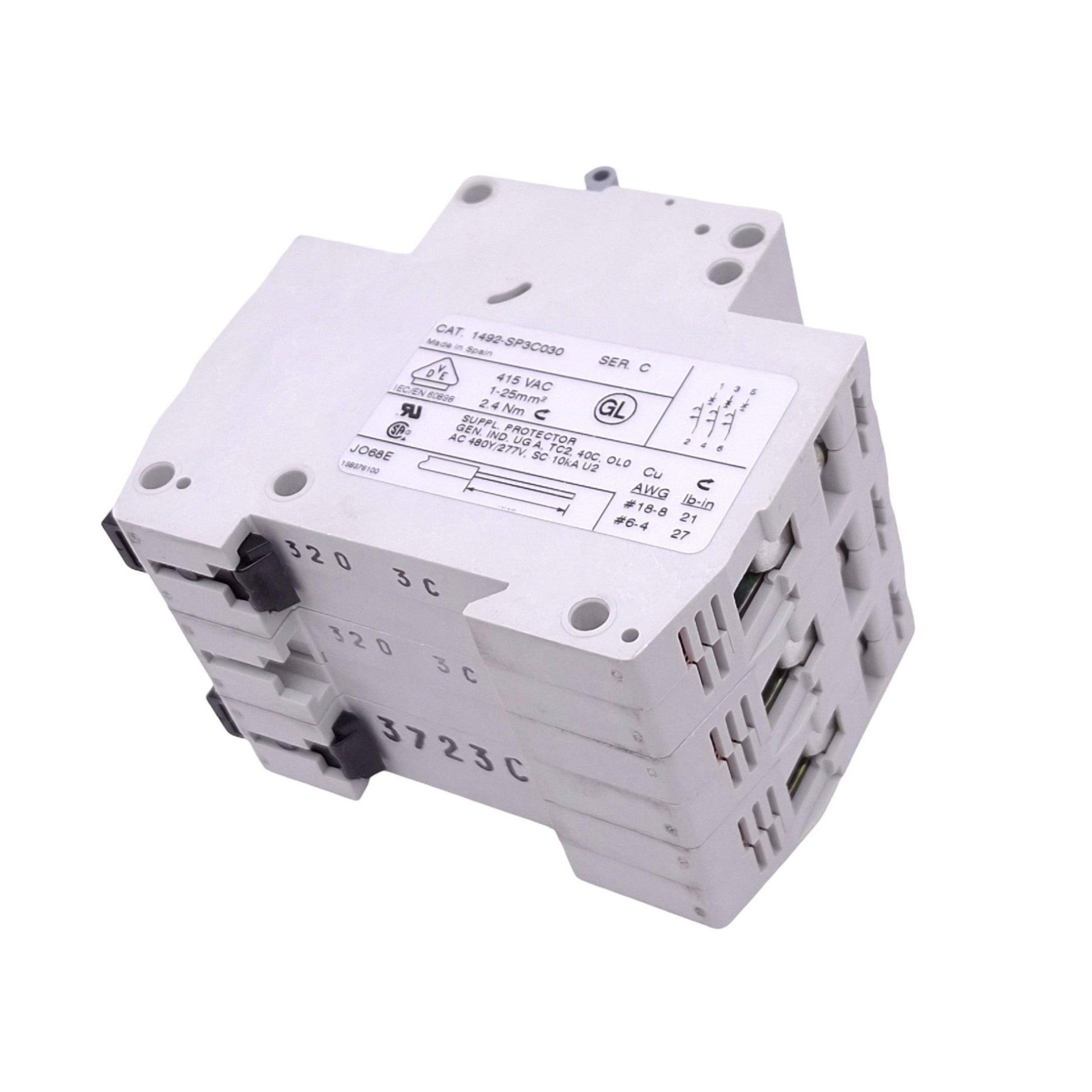 | Item Condition: New SKU: SB-212195 ST29-2-A From our inventory we are selling a Allen Bradley 1492-SP3C030 Circuit Breaker, 3-Pole 3A, 480Y/277VAC Max, DIN Rail. Specifications: