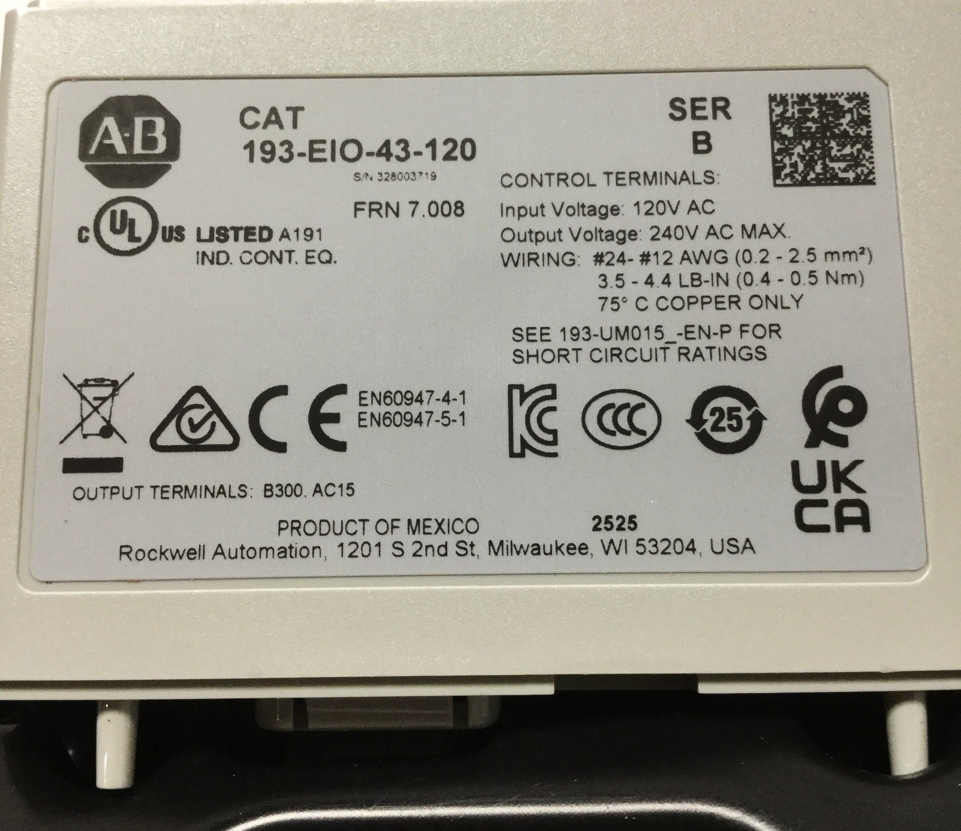 New Allen Bradley 193-EIO-43-120 E300/E200 Overload Relay Control Module 120VAC