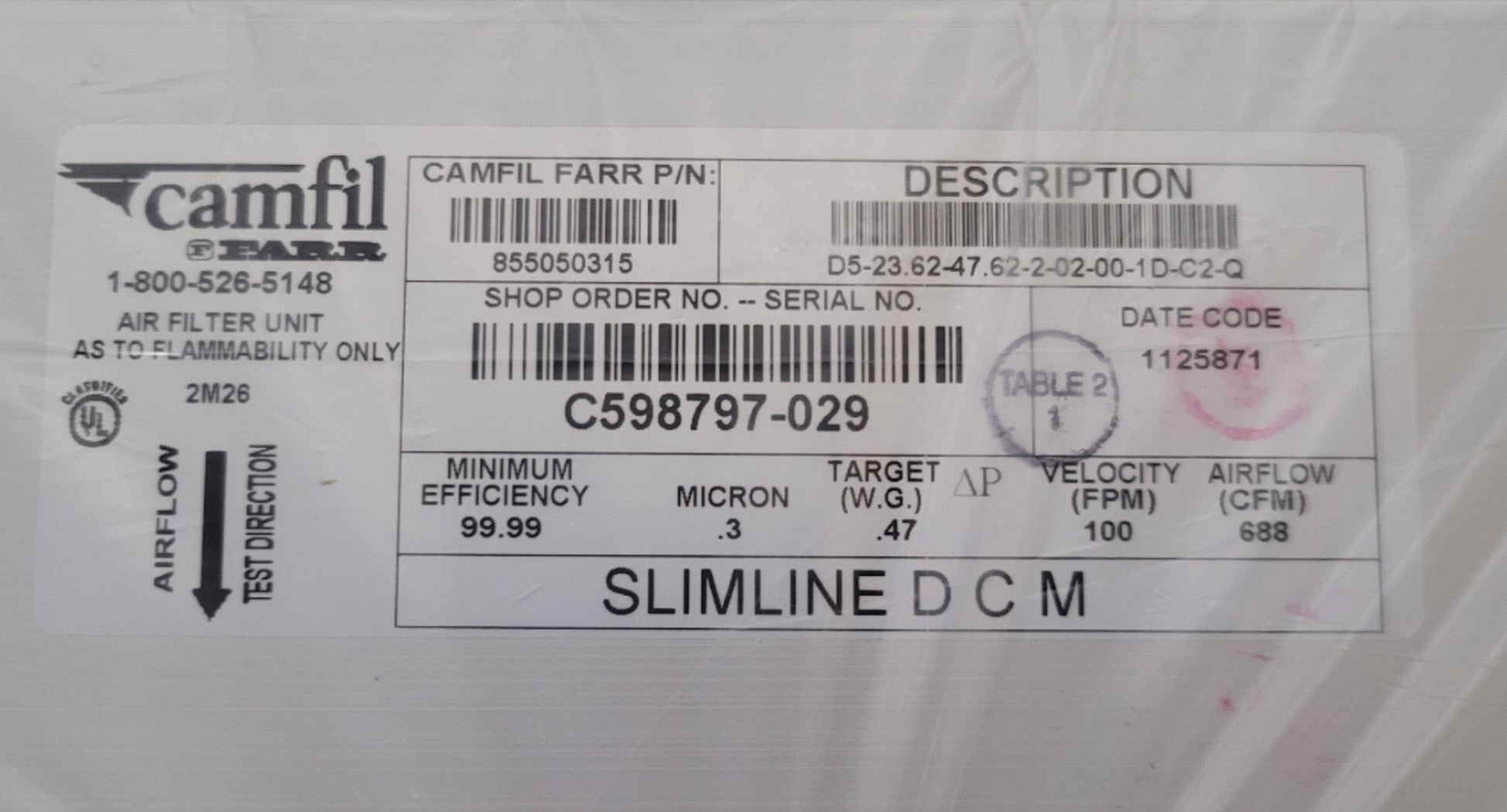 New Camfil 855050315 D5-23.62-47.62-2-02-00-1D-C2-Q Slimline HEPA Filter 2' x 4'
