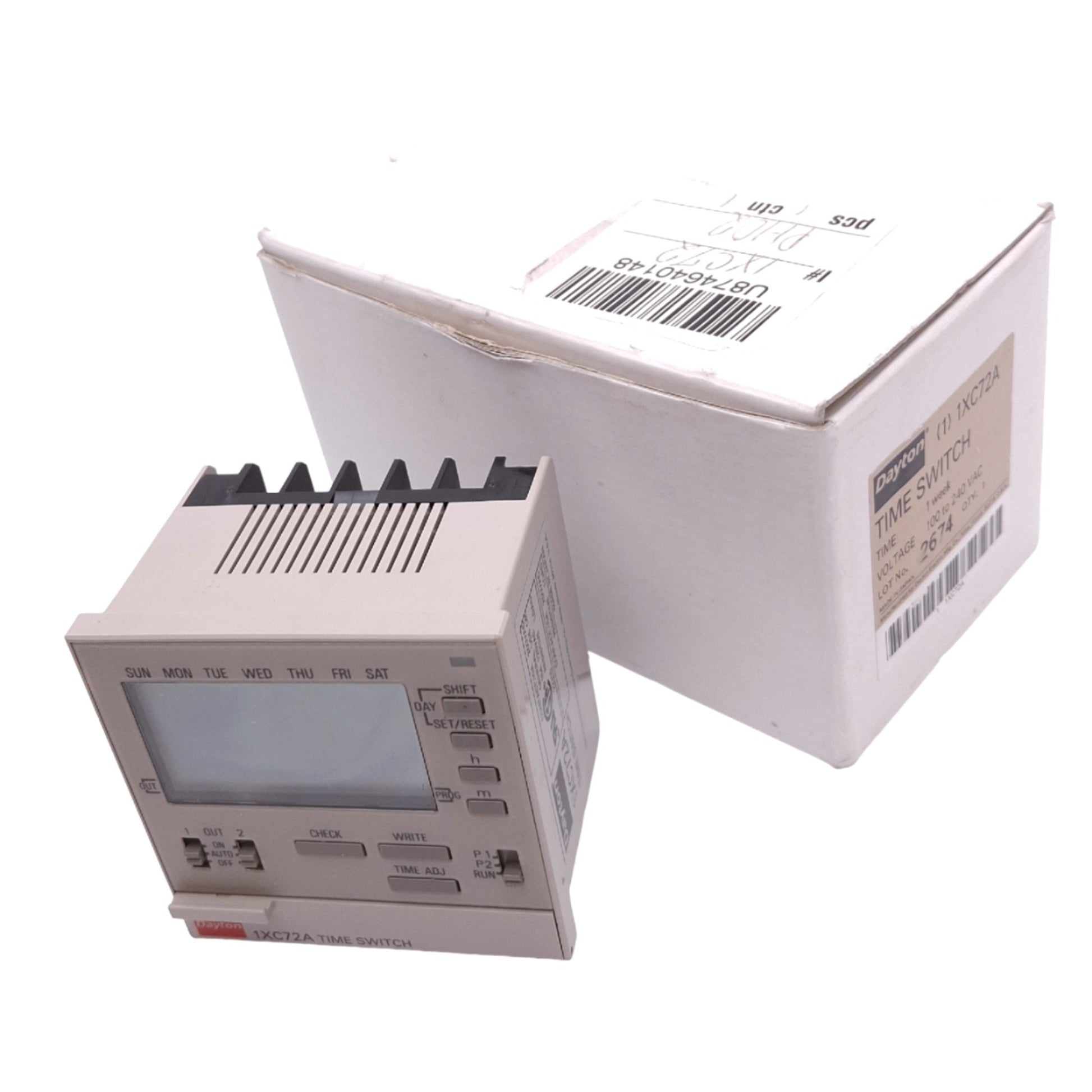 | Item Condition: New SKU: SB-208585 ST33-1-B From our inventory we are selling a Dayton 1XC72A Time Switch, 7-Day, SPST, 100-240VAC In, 10A 250VAC Max. Specifications: