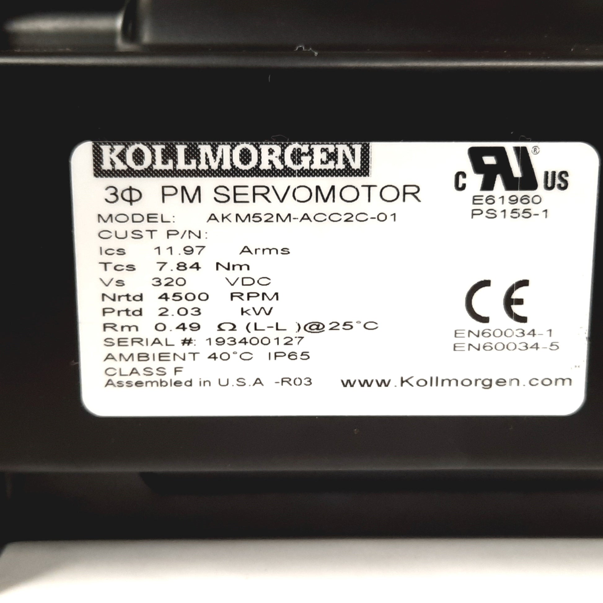 New Kollmorgen AKM52M-ACC2C-01 Servo Motor, 2.03kW, 320VDC, 4500RPM, Shaft: 24mm