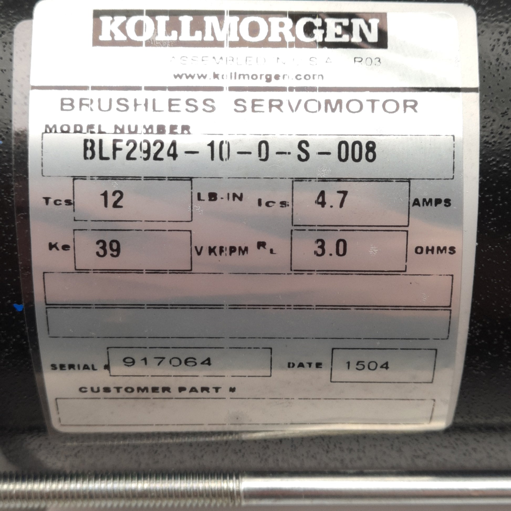From our inventory we are selling a Kollmorgen BLF2924-10-0-S-008 Brushless Servo Motor, 4.7A 39V/kRPM, 12lb-in, 3 Ohms.
