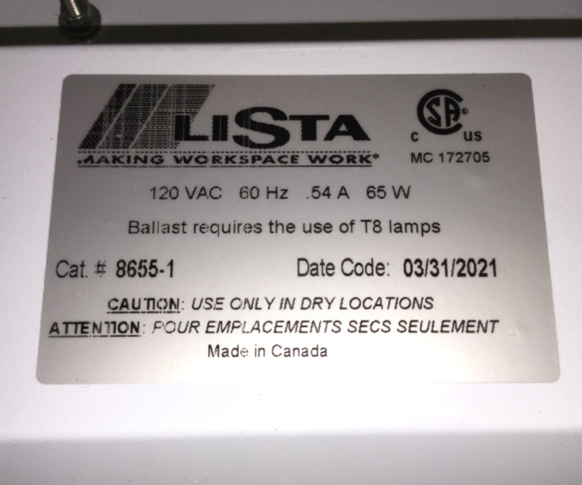 | Item Condition: New SKU: SB-168685 P2-2 From our inventory we are selling a Lista 8655-1 Dual Fluorescent Lamp Workbench Light Fixture, T8 Ballast, 60" L. Specifications: