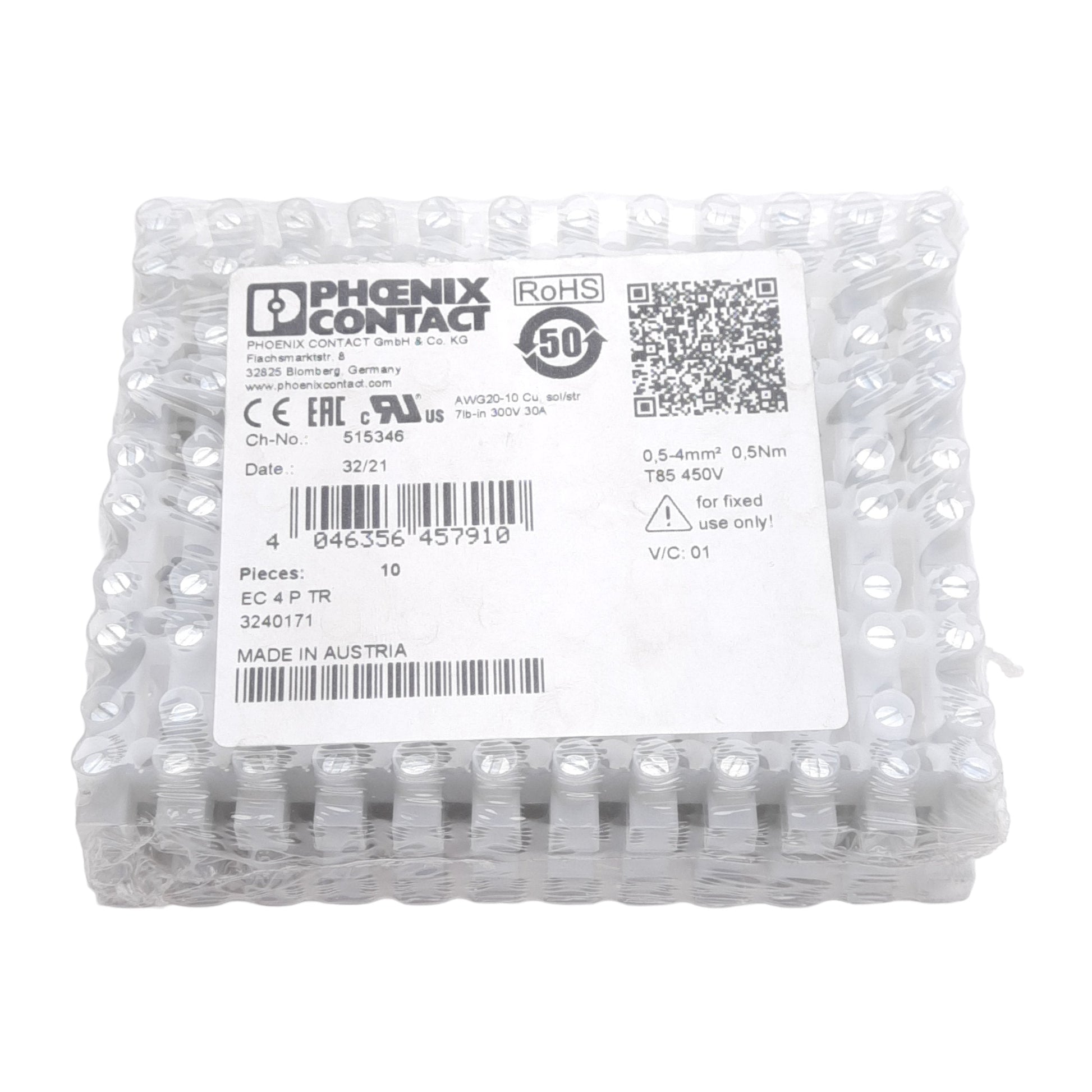 New Lot of 10 Phoenix Contact 3240171 Terminal Strip, 12-Position, 450V 32A