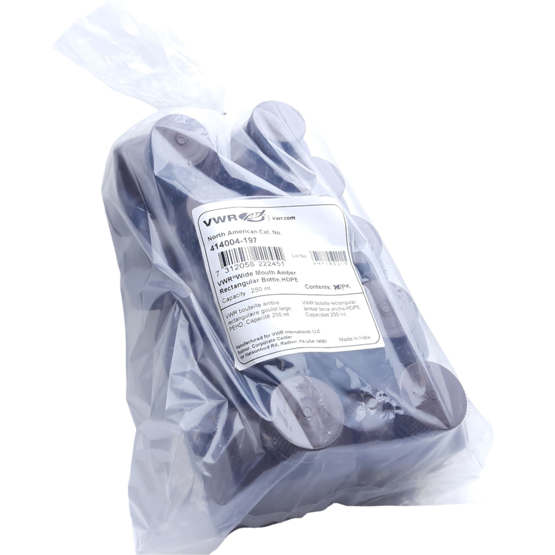 New Lot of 10 VWR 414004-197 Wide Mouth Amber Rectangle Bottle HDPE, 38mm cap, 250mL