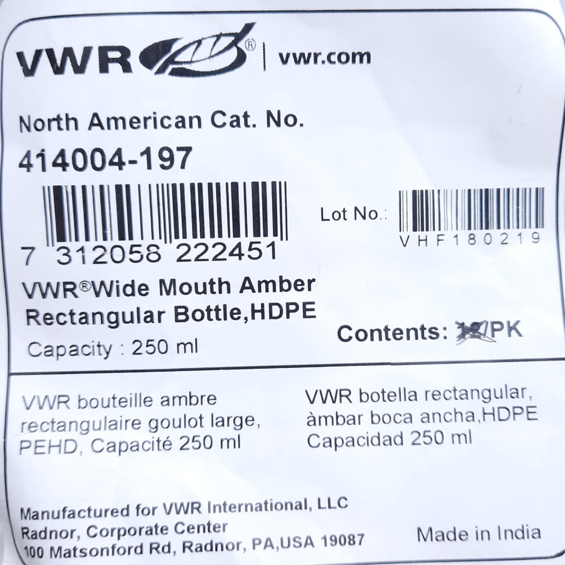 | Item Condition: New SKU: SB-201526 ND-2-A From our inventory we are selling a Lot of 10 VWR 414004-197 Wide Mouth Amber Rectangle Bottle HDPE, 38mm cap, 250mL. Specifications: