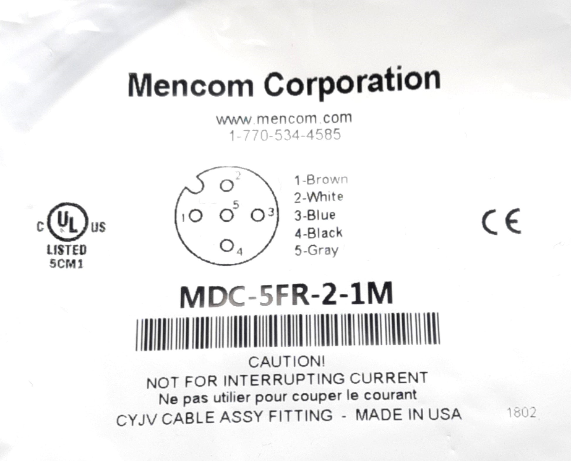 New Lot of 3 Mencom MDC-5FR-2-1M Panel Mount Connector 5-Pin Female M12, 1m