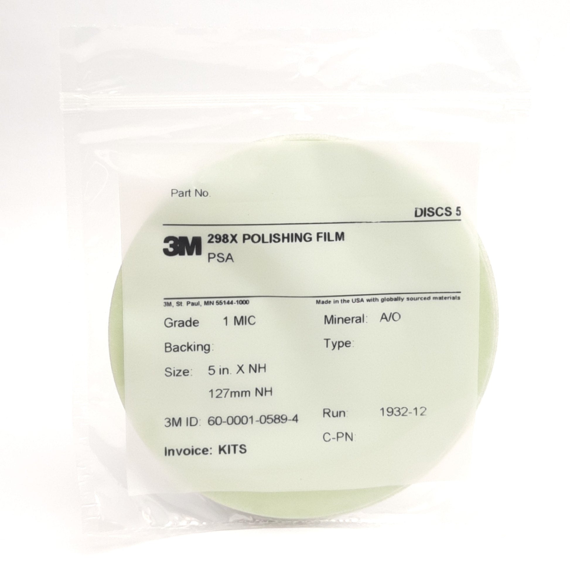 | Item Condition: New SKU: SB-176413 ST22-4-A From our inventory we are selling a Lot of 5 3M 298X Polishing Film Disc Grade: 1MIC, 5" Diameter, Light Green. Specifications: