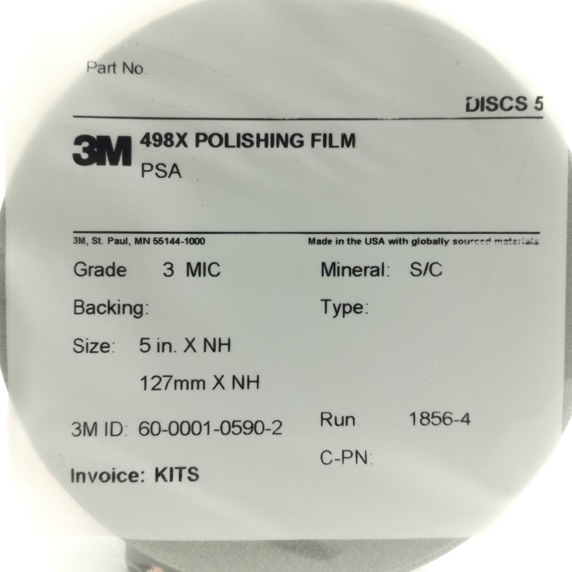 New Lot of 5 3M 498X Polishing Film Disc Grade: 3Mic, 5" Diameter, 60-0001590-2