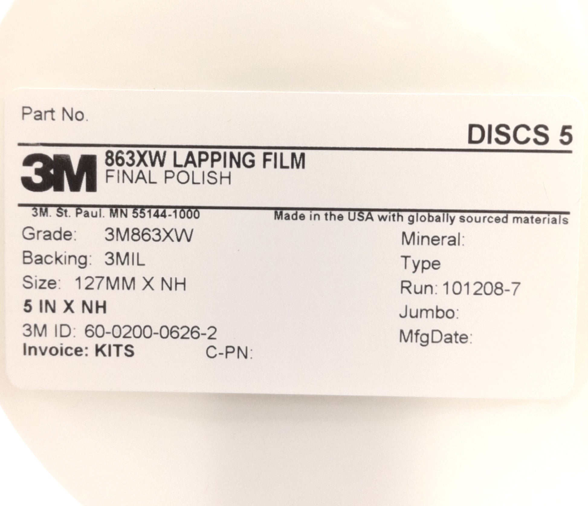 New Lot of 5 3M 863XW Final Polish Film, Grade: 3M863XW, 5" Diameter, 60-0200-0626-2