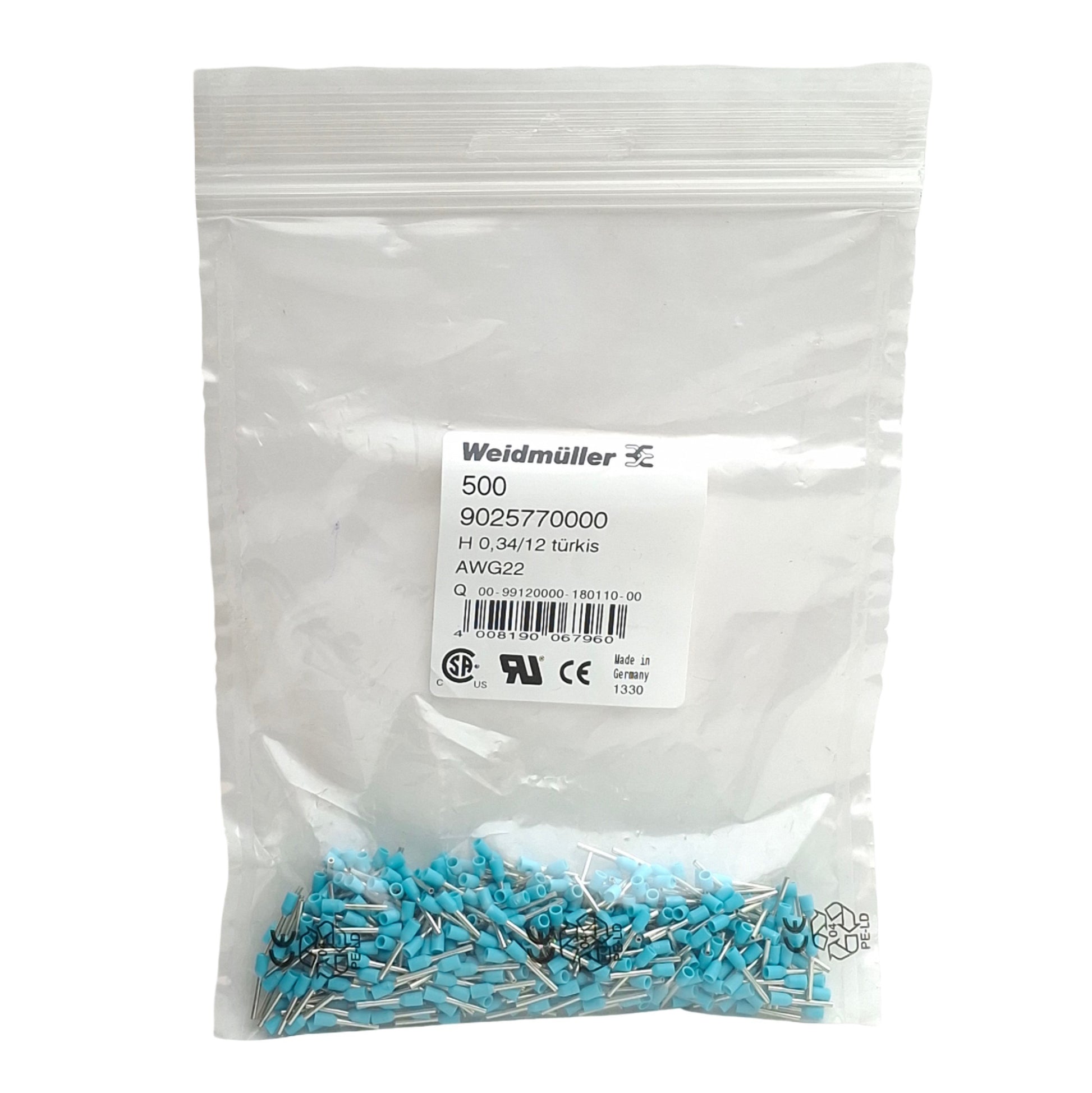New Lot of 500 Weidmuller 9025770000 Wire End Ferrules, H0,34/12 turkis, AWG22