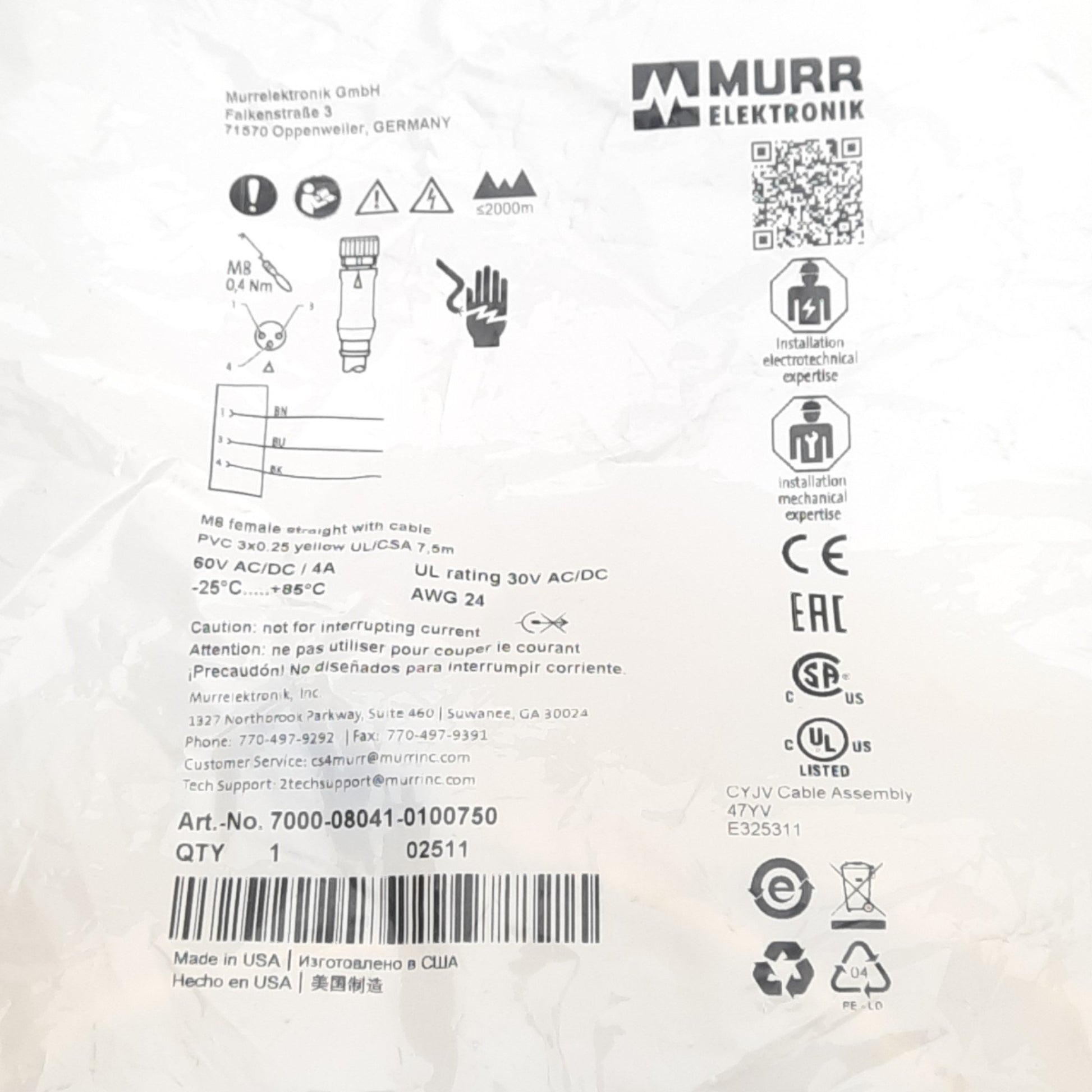 New Murr Elektronik 7000-08041-0100750 Sensor Cable, M8 3-Pin F, 60V, 7.5m Length