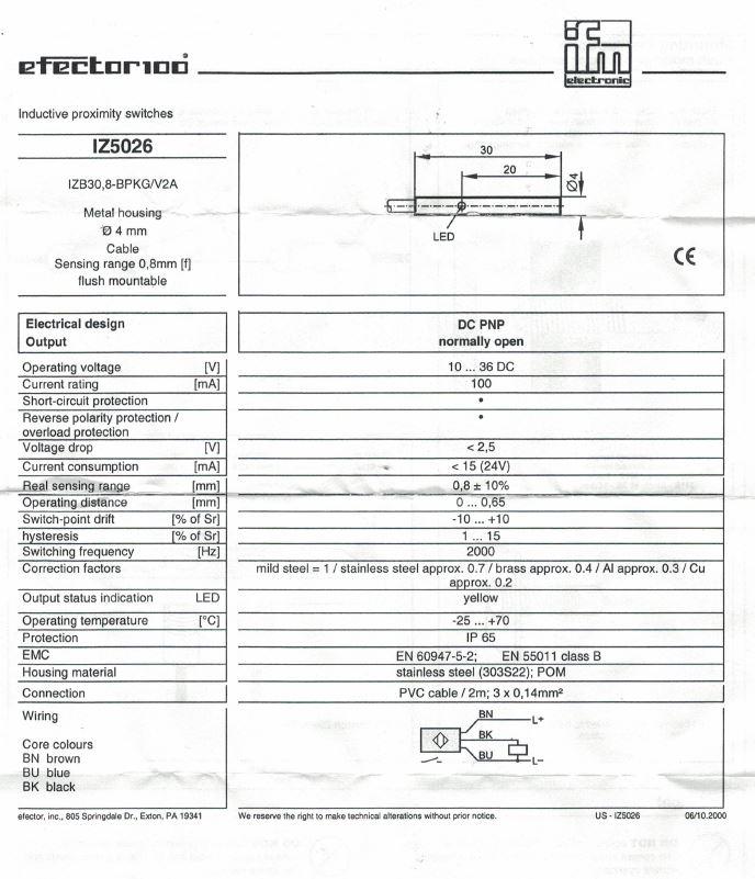 | Item Condition: New SKU: SB-103961 ST23-5-E From our inventory we are selling a New IFM Efector IZ5026 Inductive Proximity Switch, PNP Normally Open, 24VDC. Specifications:
