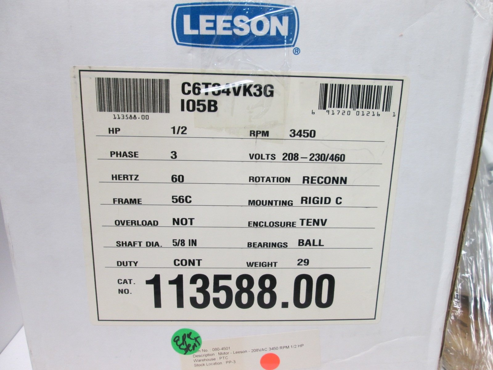 New Leeson 113588.00 Electric Motor, Voltage: 208-230/460V, Speed: 3450RPM