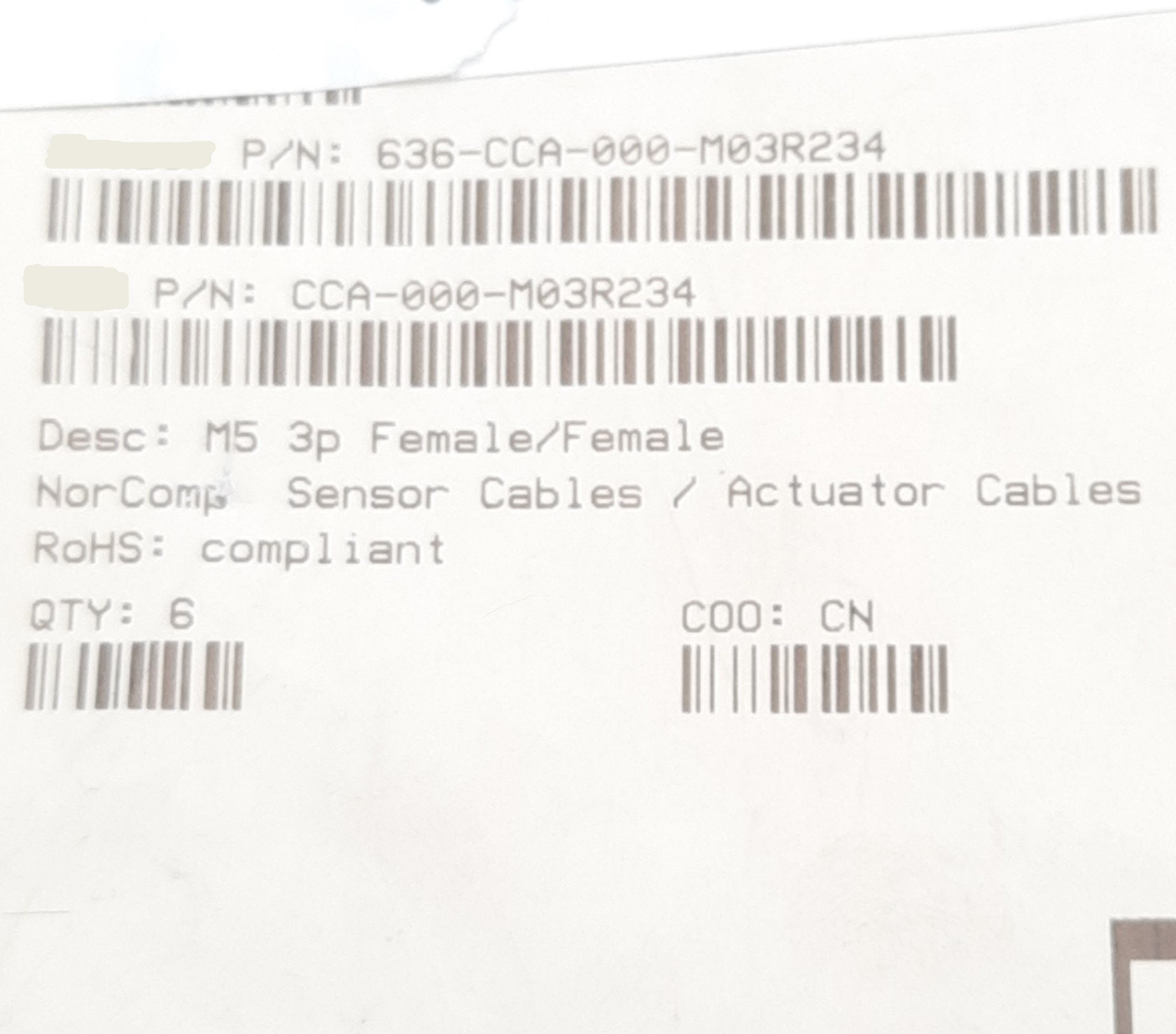 New NorComp 636-CCA-000-M03R234 Cable, M5 3-Pin Female, Double Ended, 30V, 3m
