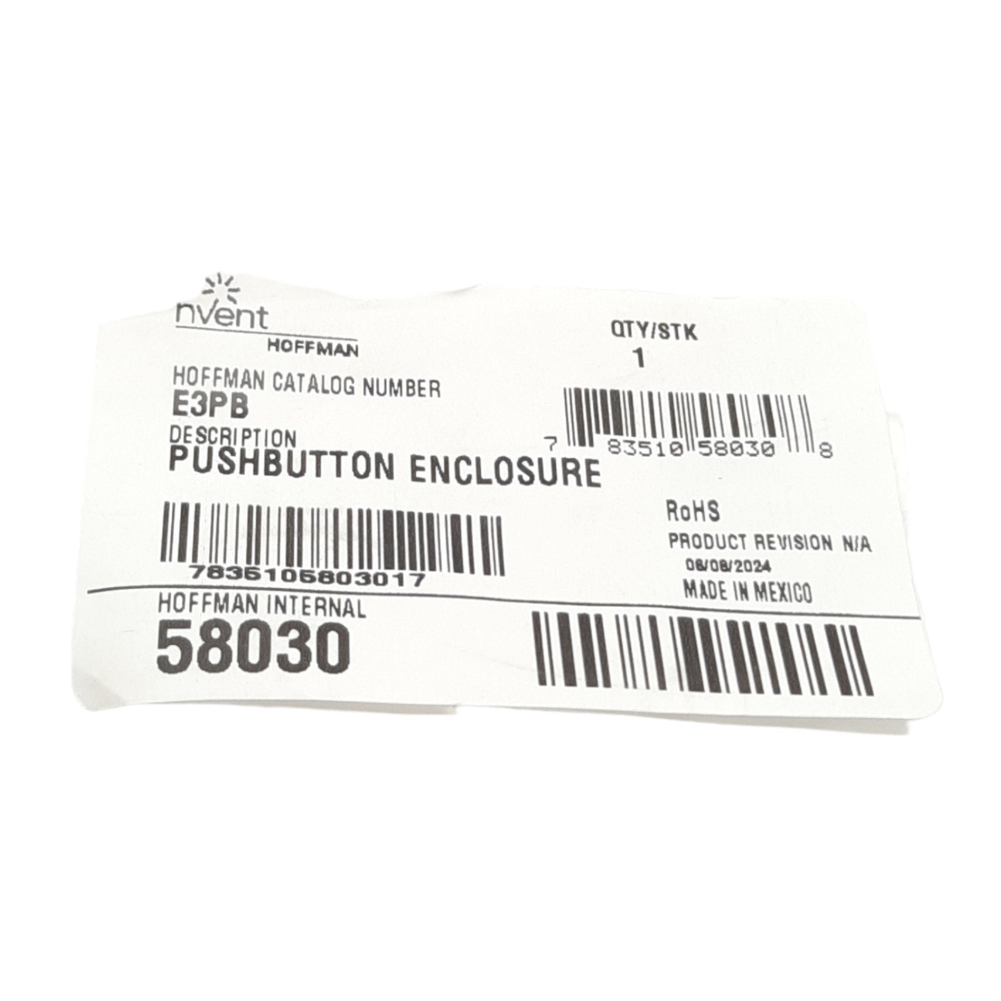 New nVent Hoffman E3PB Pushbutton Enclosure, 3-Hole, 8in x 3.25in x 2.75in