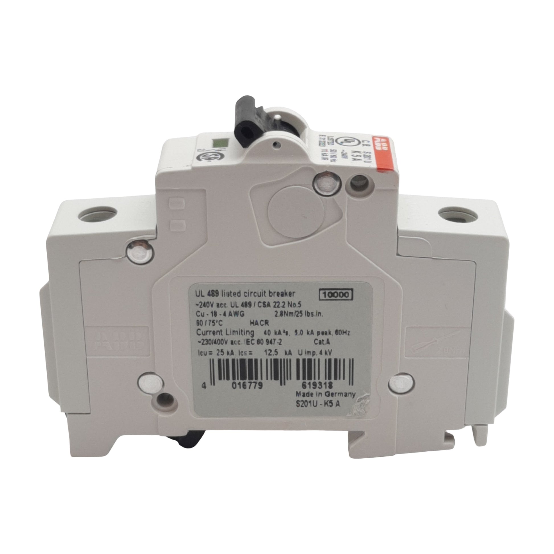 New – Open box ABB S201U-K5A Circuit Breaker, 1-Pole, 5A 240VAC, K-Curve, DIN Rail Mount