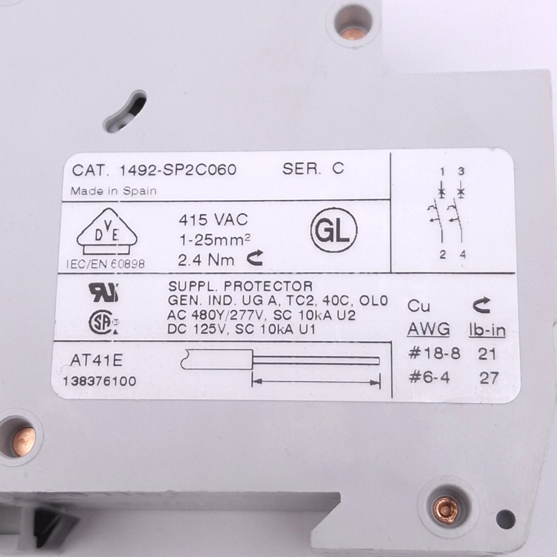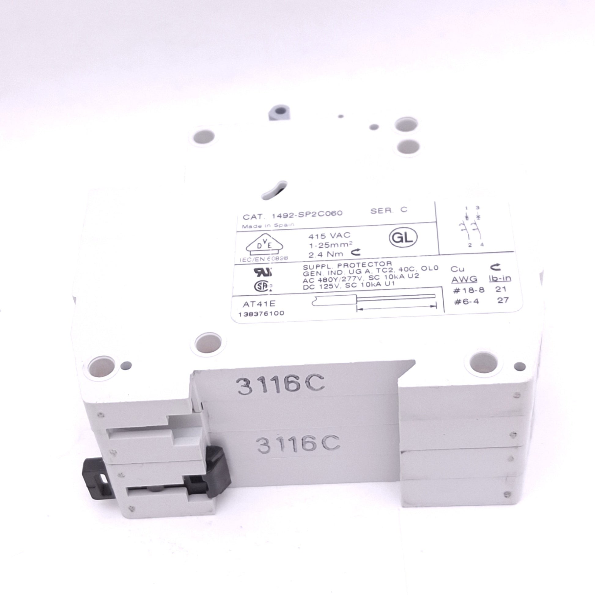 | Item Condition: New – Open box SKU: SB-211802 ST4-5-E From our inventory we are selling a Allen Bradley 1492-SP2C060 Circuit Breaker, 2-Pole 6A, 480Y/277VAC, DIN Rail. Specifications: