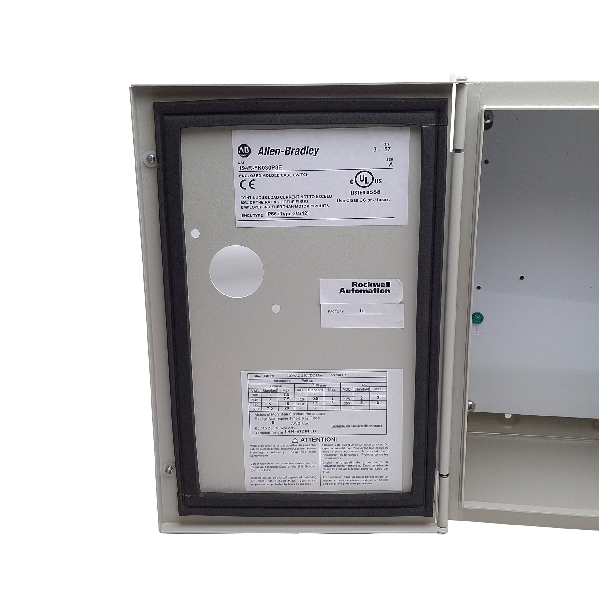 New – Open box Allen Bradley 194R-FN030P3E Switch Enclosure, 300 x 200 x 160mm *Enclosure Only*
