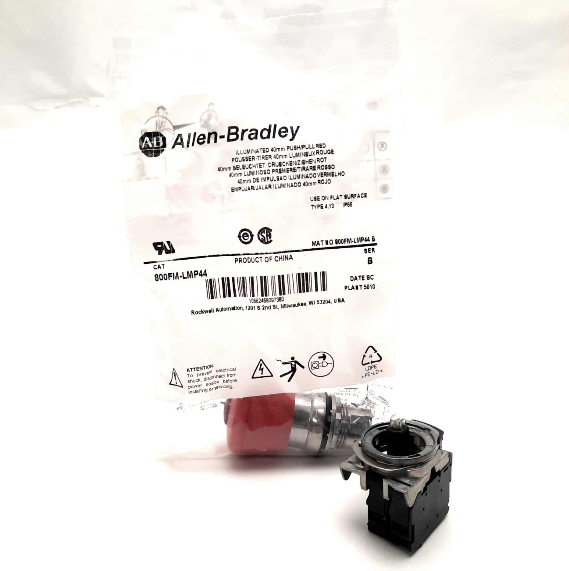 New – Open box Allen-Bradley 800FM-LMP44 Push-Pull Operator 22mm, 24v AC/DC, With 1 NC Contact