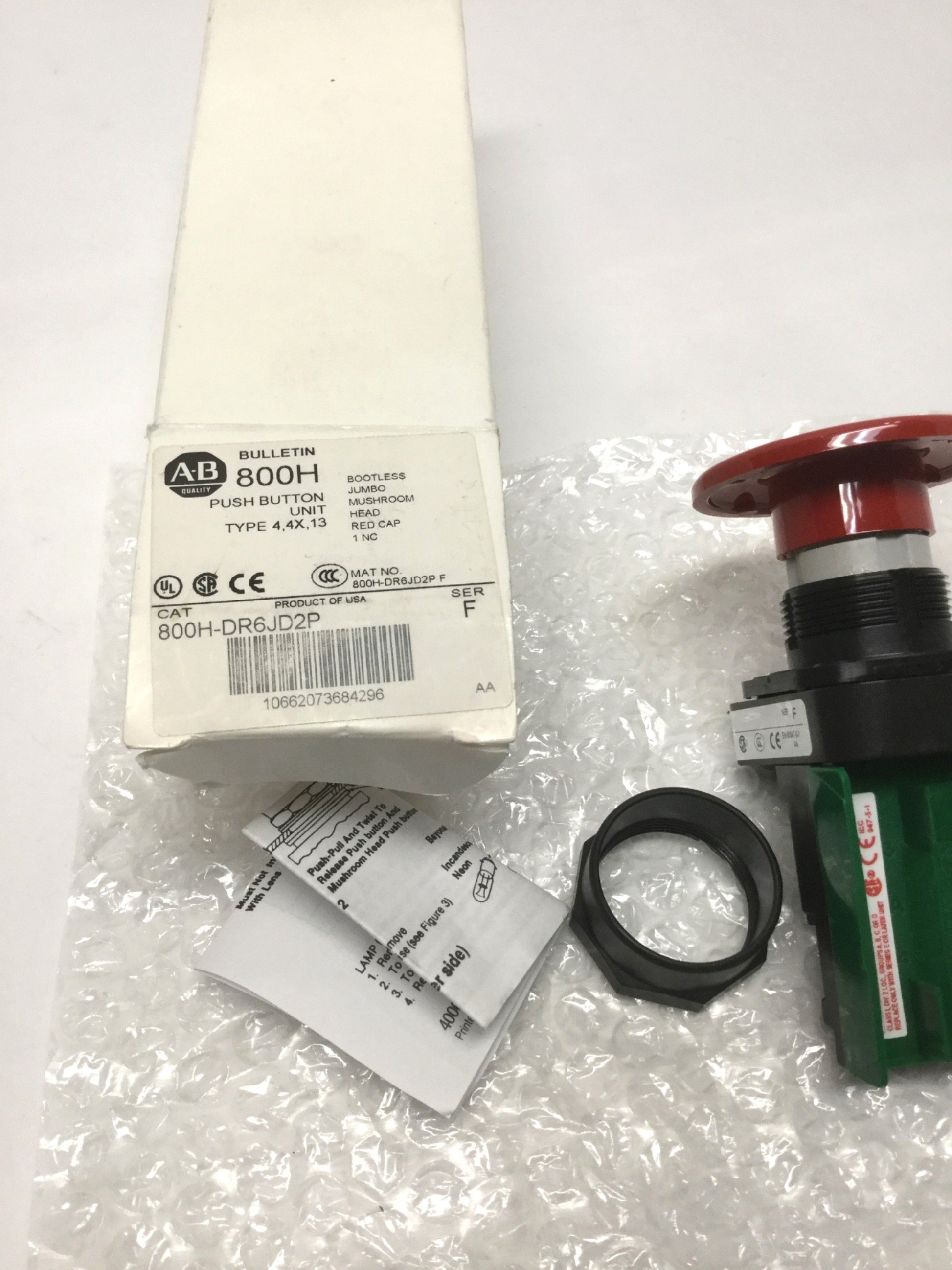 New – Open box Allen Bradley 800H-DR6JD2P Jumbo Red Mushroom Momentary Pushbutton Switch, 1NC