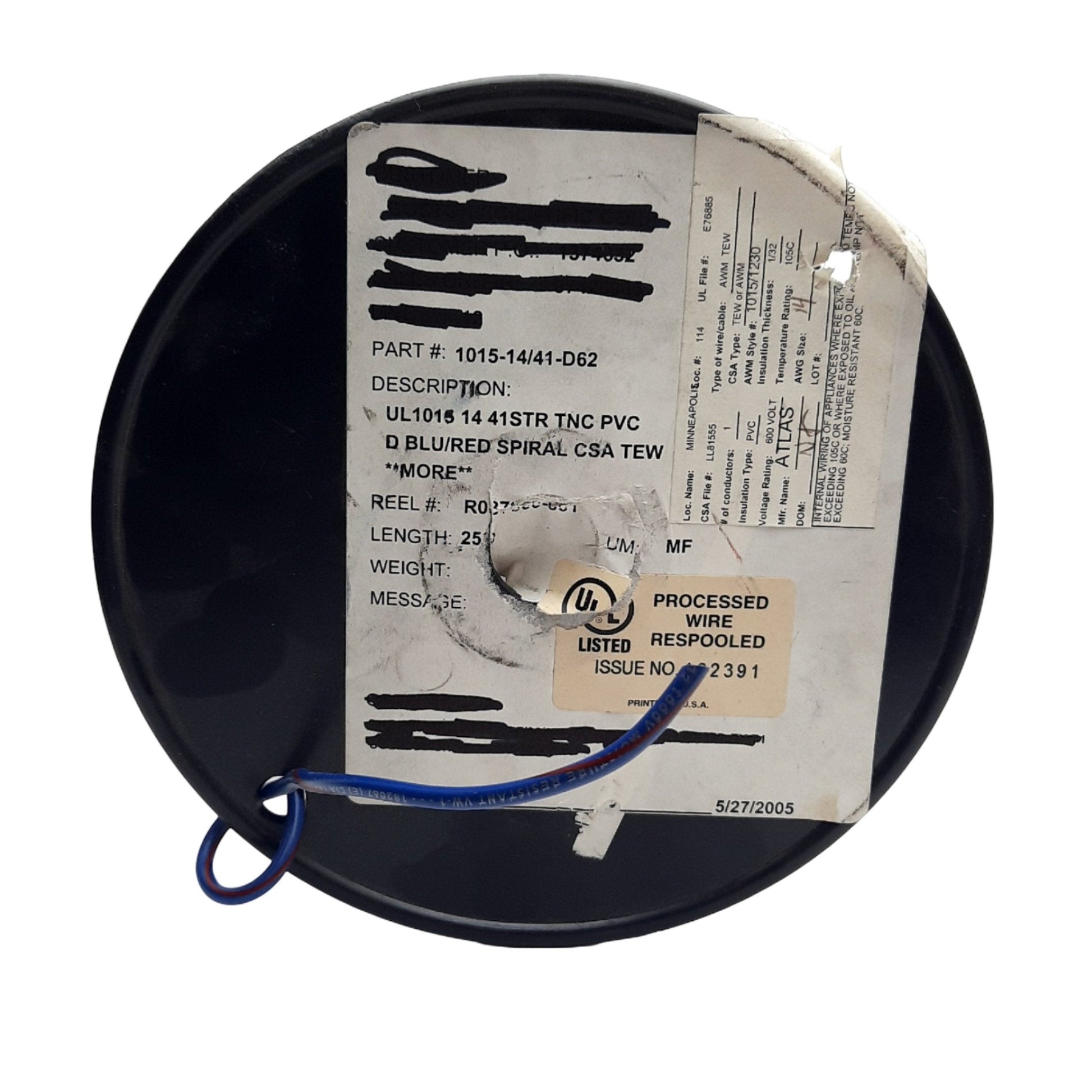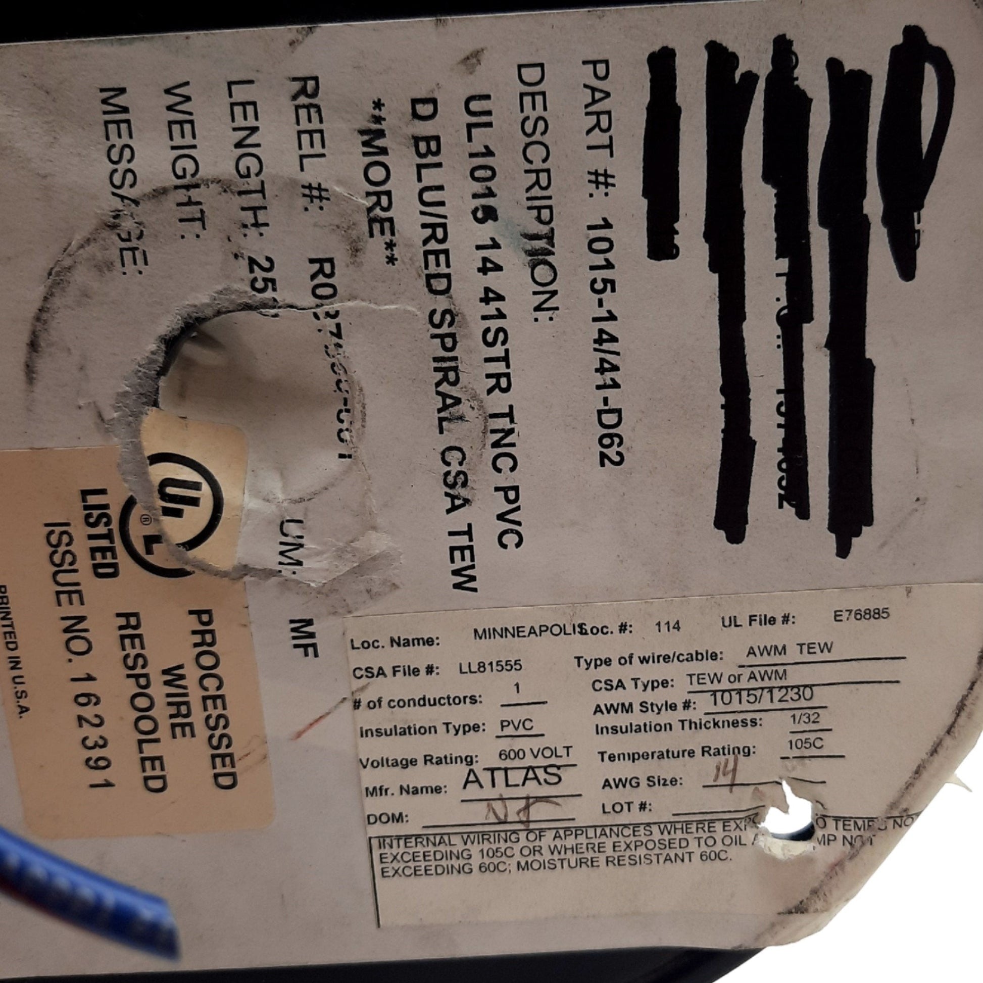 | Item Condition: New – Open box SKU: SB-200735 RM-5-B From our inventory we are selling a Atlas UL1015 Hook-Up Wire, 14 Gauge 200 Feet Blue/ Red Spiral PVC/TEW 600V. Specifications: