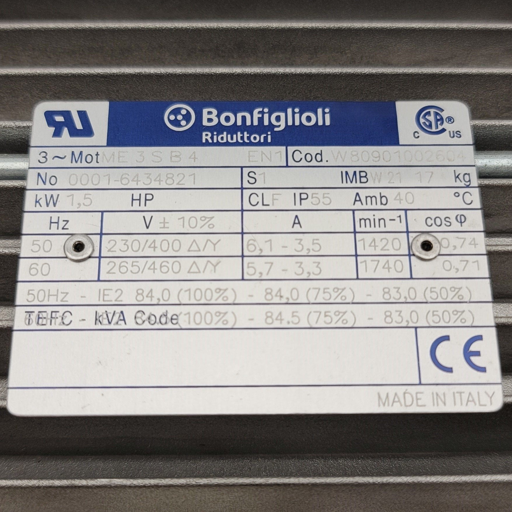New – Open box Bonfiglioli Gearmotor ME 3SB 4 230/400-50 & C 21 2 P 4.8 S3 B6 AN, 4.8:1, 1.5Kw