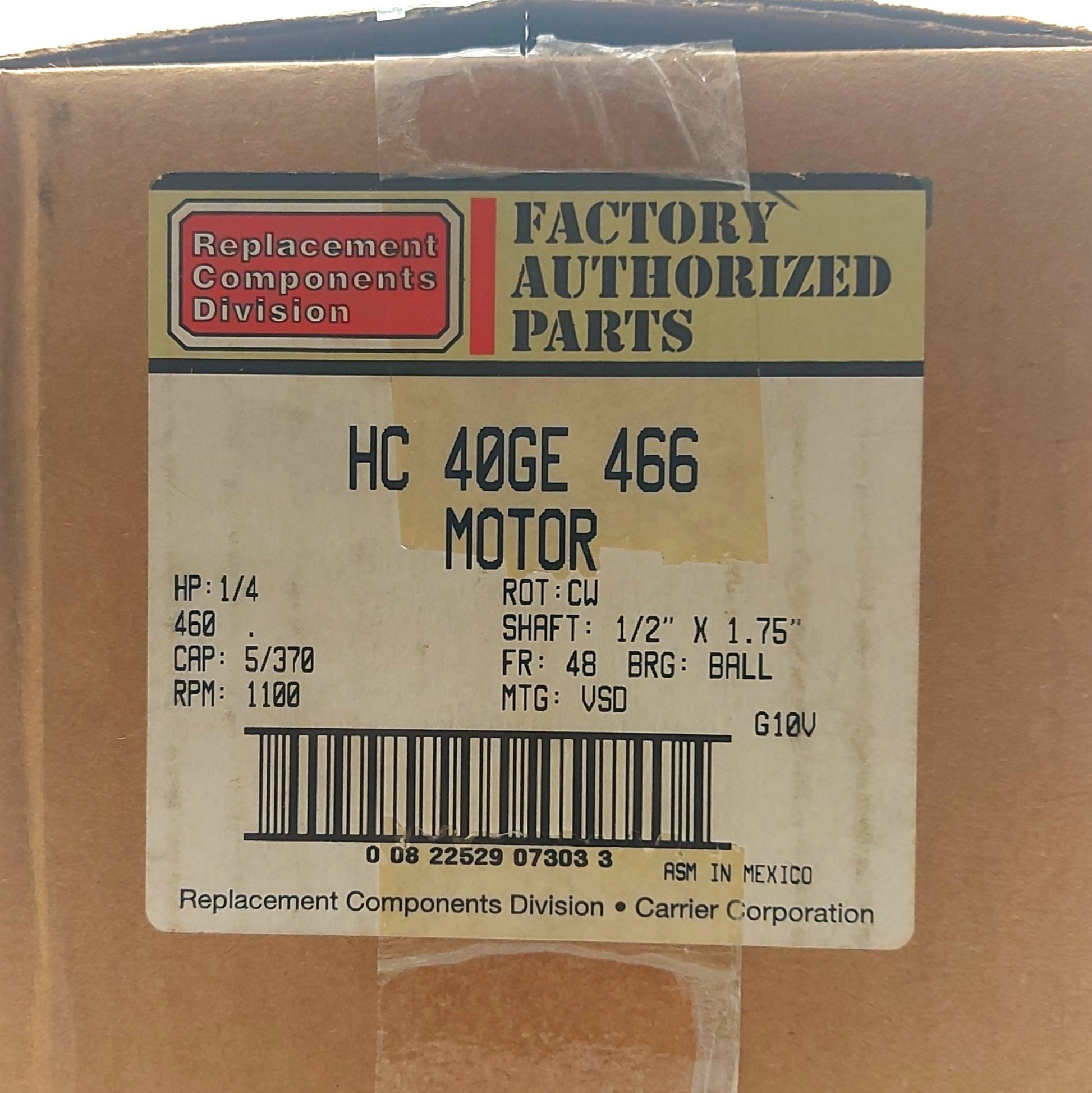 New – Open box Carrier HC40GE466 Condenser Fan Motor, 1/4HP, 1100RPM, 1/2"Shaft, 1-Phase 460VAC