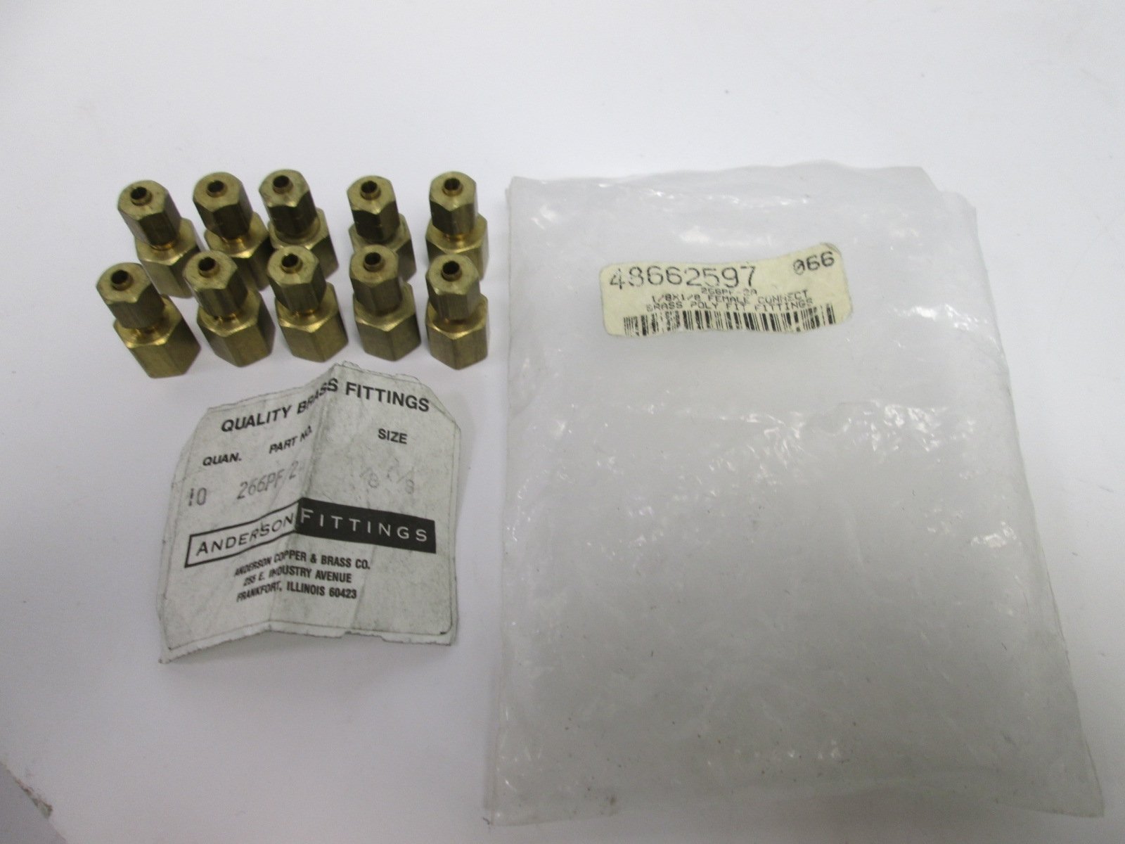 New – Open box Lot of 10 New 266PF-2A 1/8" Male x 1/8" Female Poly Fittings, Material: Brass