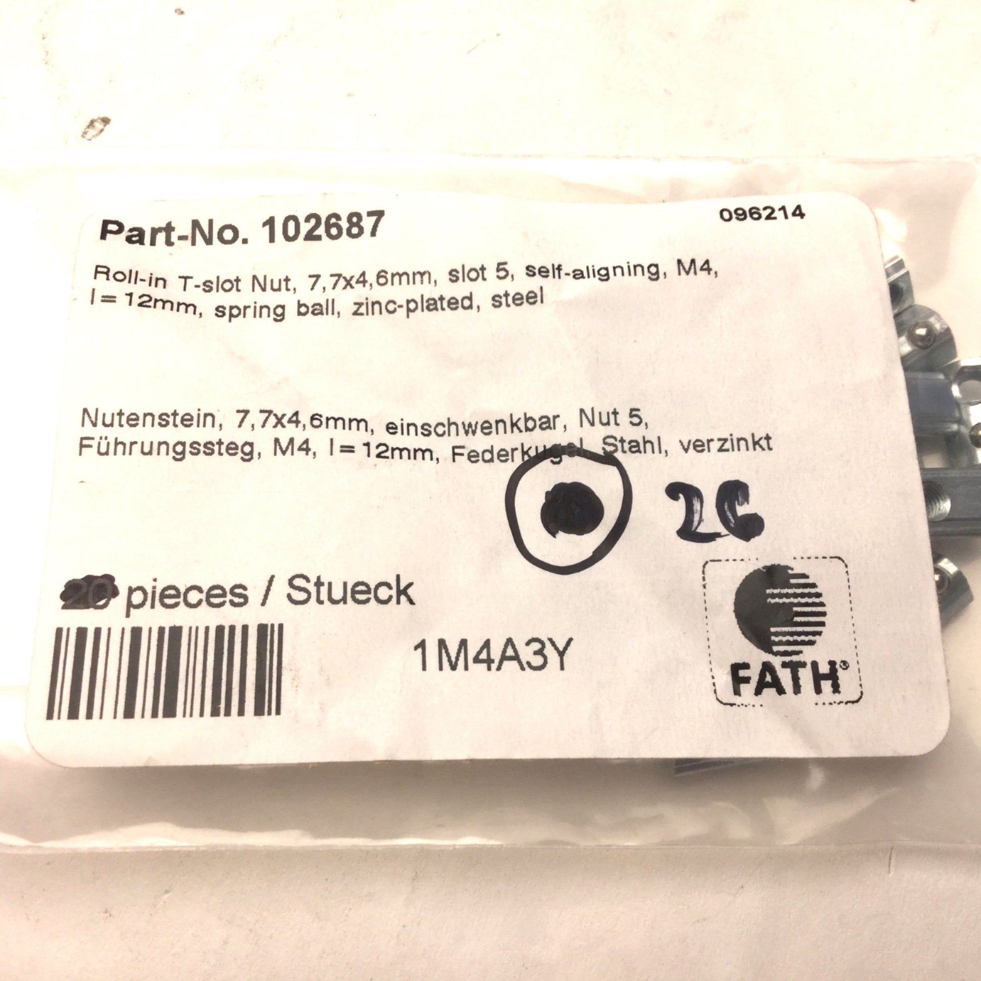 New – Open box Lot of 26 Fath 102687 Roll-In T-Slot Nut, 7.7 x 4.6mm, With Spring Loaded Ball
