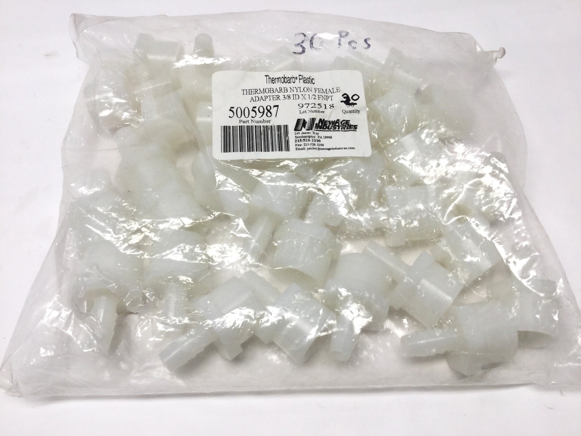 New – Open box Lot of 30 NewAge 5005987 Thermobarb Nylon Adapters, 3/8" Barb x 1/2" NPT Female