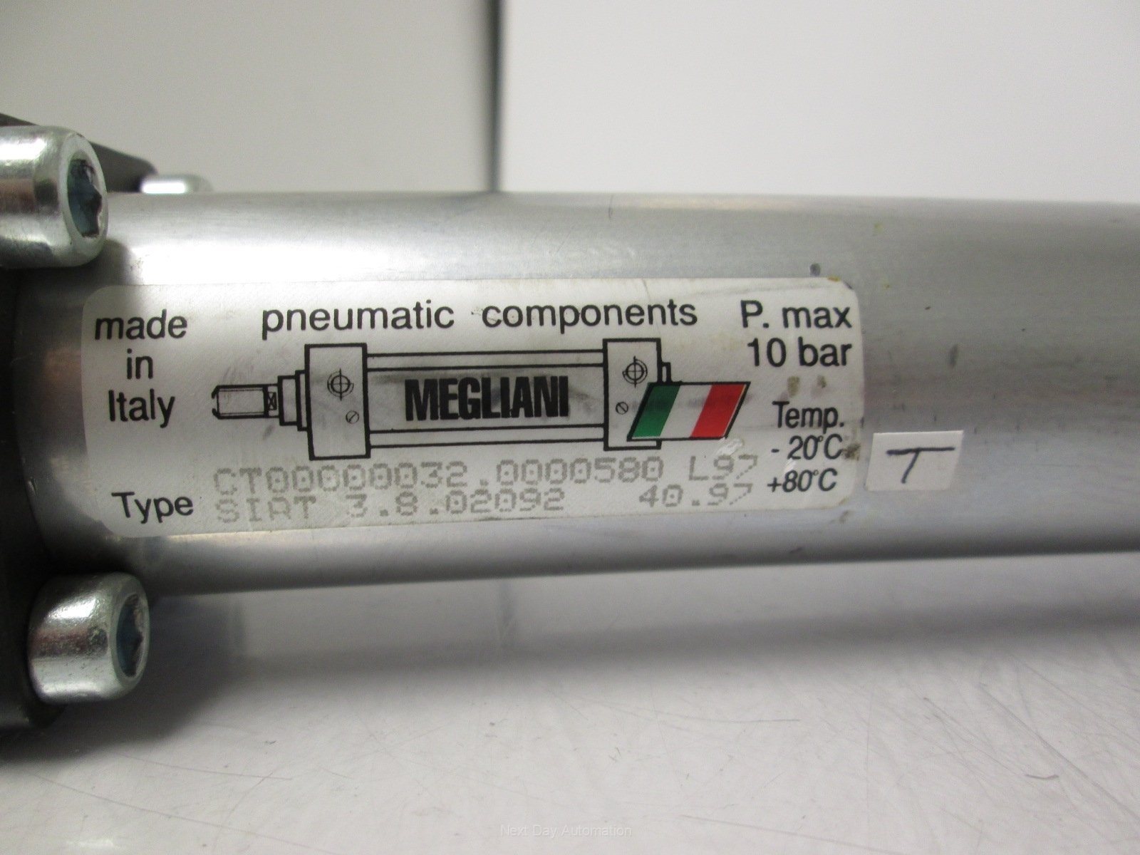 | Item Condition: New – Open box SKU: SB-090754 ST47-6 From our inventory we are selling a Megliani SIAT 3.8.02092 Pneumatic Cylinder 575mm Stroke 1/8" Ports M10x1.25 Rod. Specifications: