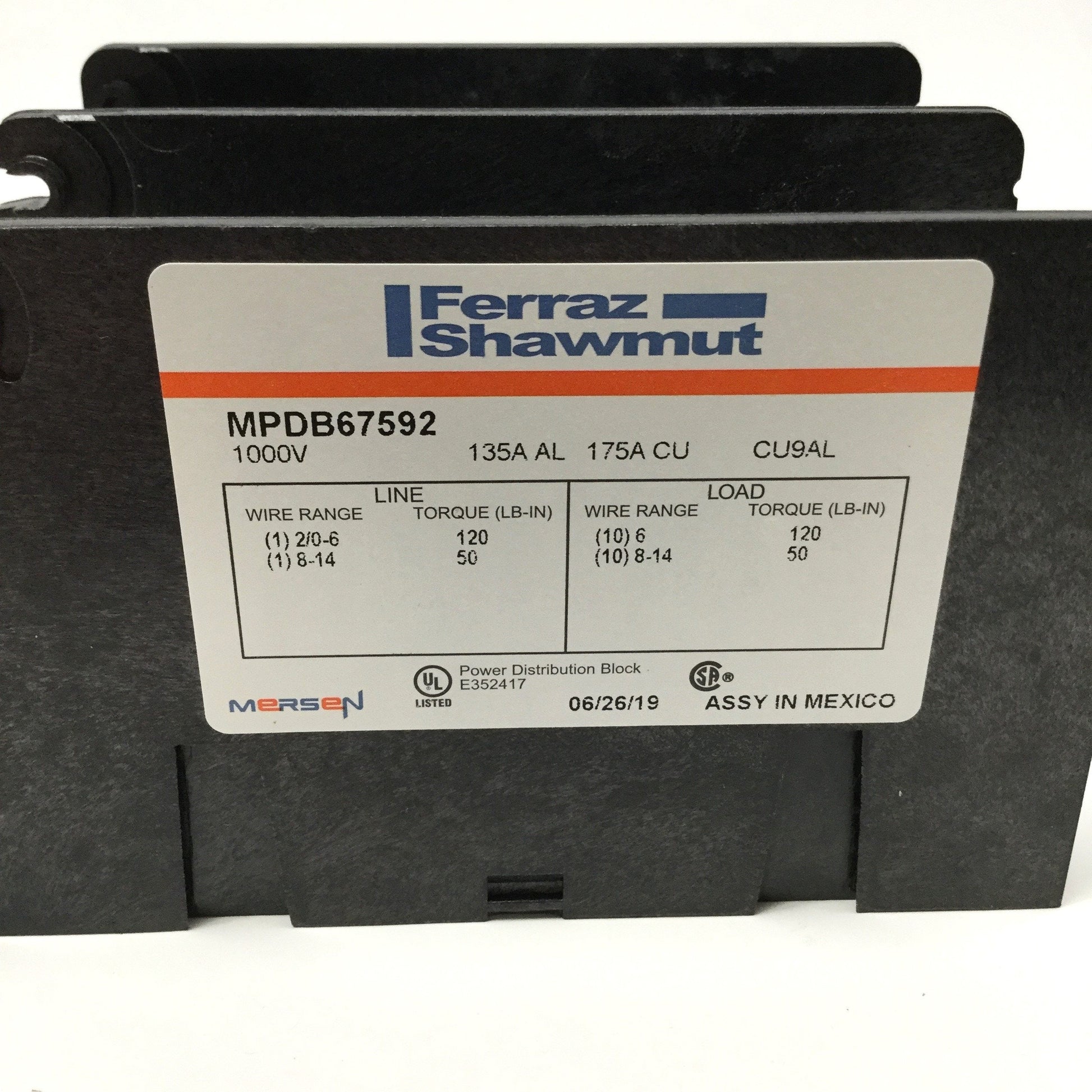 | Item Condition: New – Open box SKU: SB-189817 ST74-6-F From our inventory we are selling a Ferraz Shawmut MPDB67112 Power Block Distribution 2 Pole, 600 V, 200 A. Specifications: