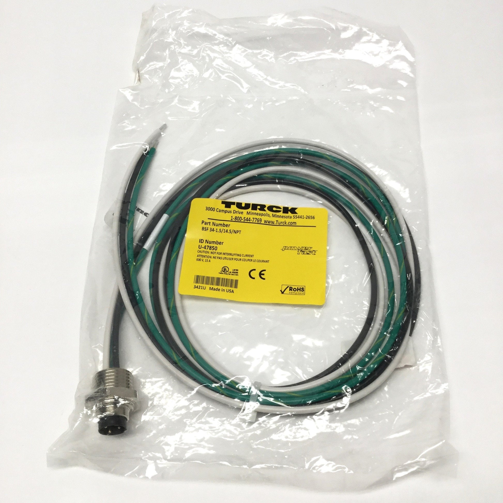 New – Open box Turck BSF 34-1.5/14.5/NPT Powerfast Receptacle M16 3-Pin to 1/2" NPT, 1.5m Long