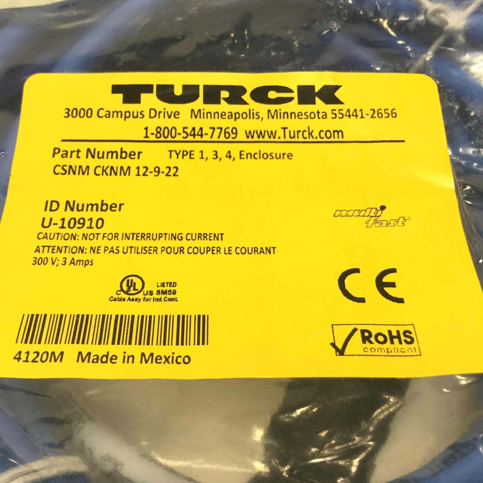 New – Open box Turck CSNM CKNM 12-9-22 Cordset Cable M23 12-Pin, 9-Wire Male to Female, 22m