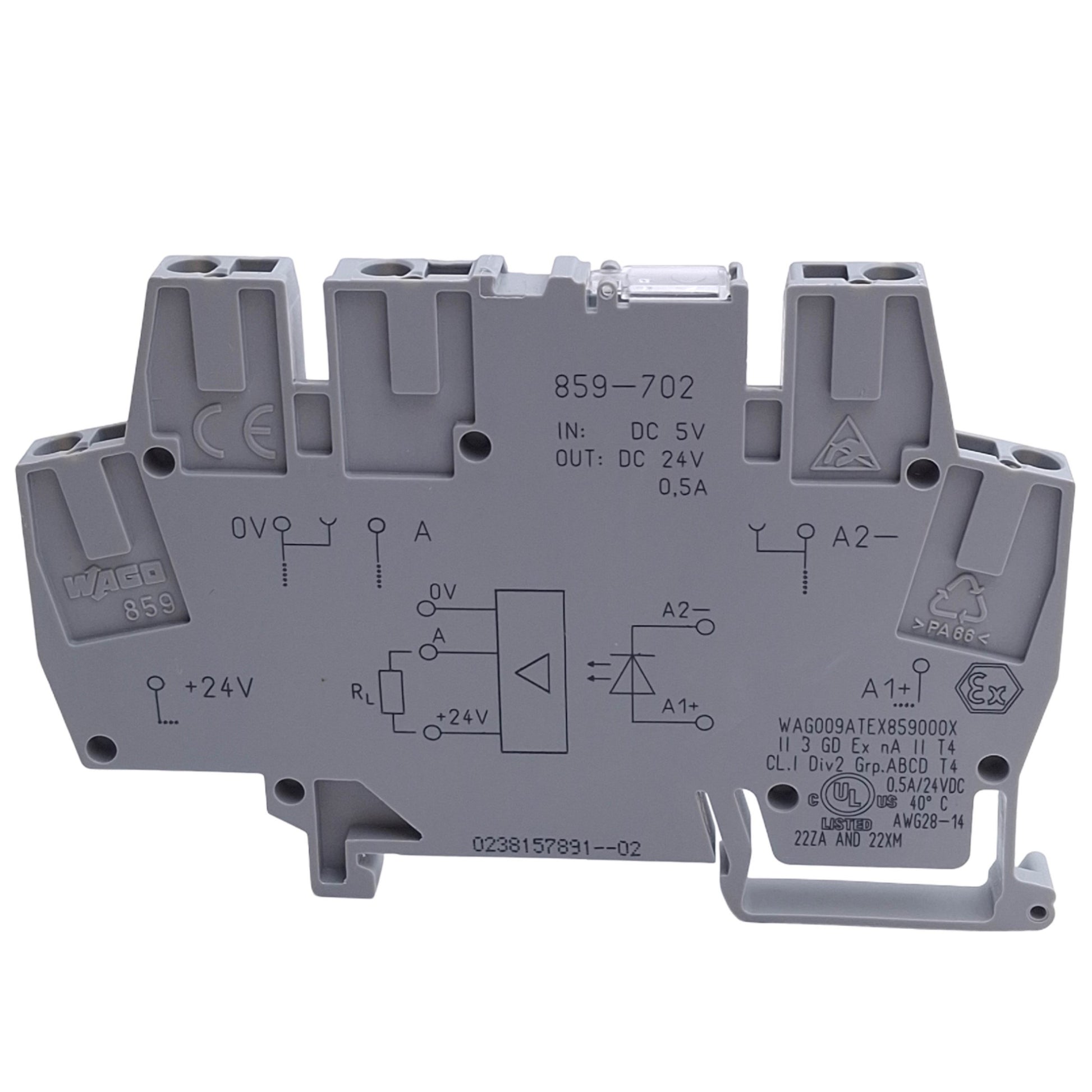 New – Open box Wago 859-702 Optocoupler Module 5V DC Input, 0.5A, 0-24V DC Out, SPST-NO