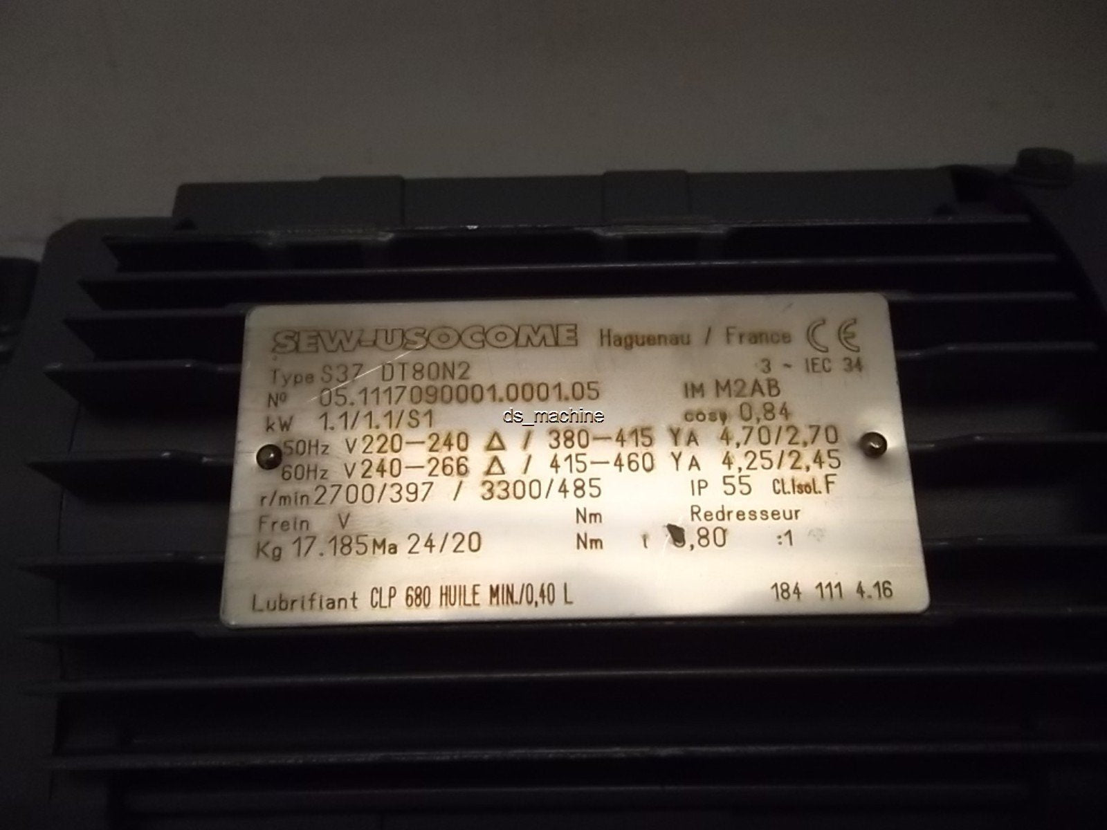 New Sew S37 DT80N2 Gearmotor 6.80:1 Ratio, 240V, 1.1KW, 2700RPM, 20mm-OD