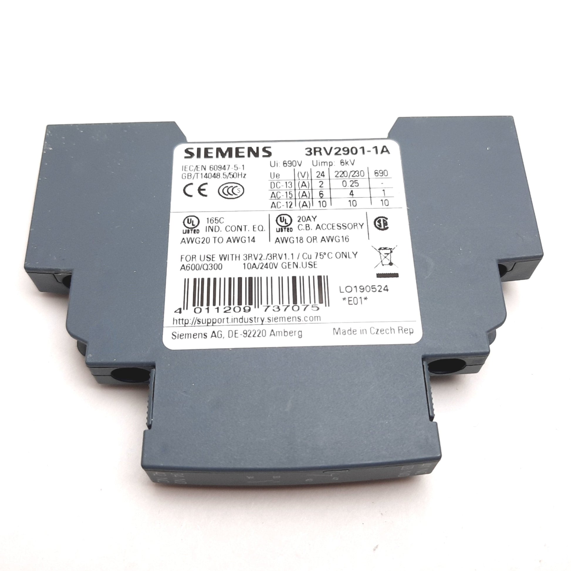 New Siemens 3RV2901-1A Auxiliary Contact Block, 1x N/O 1x N/C, Rating: 10A 240VAC