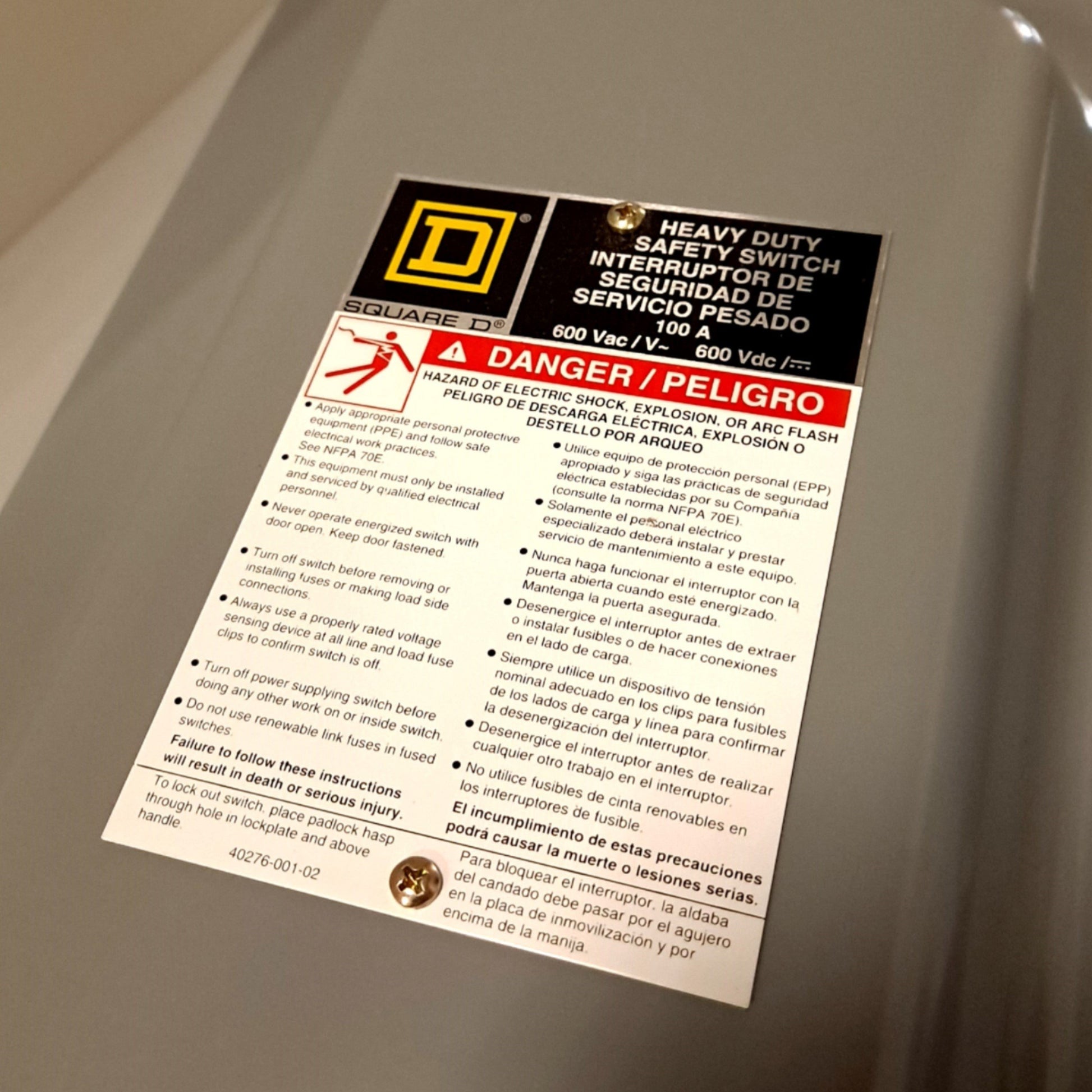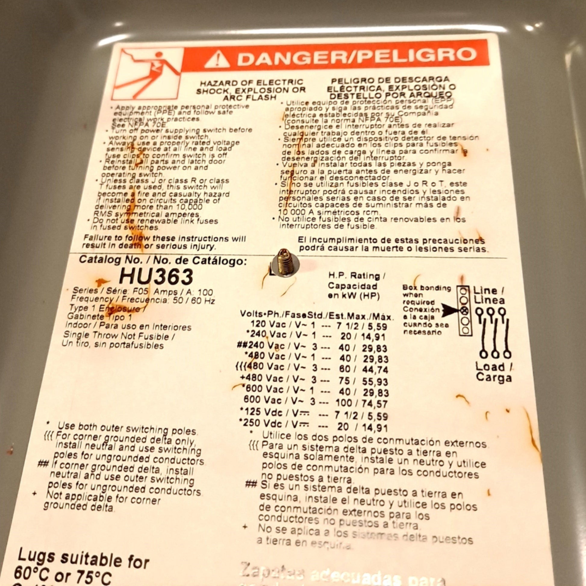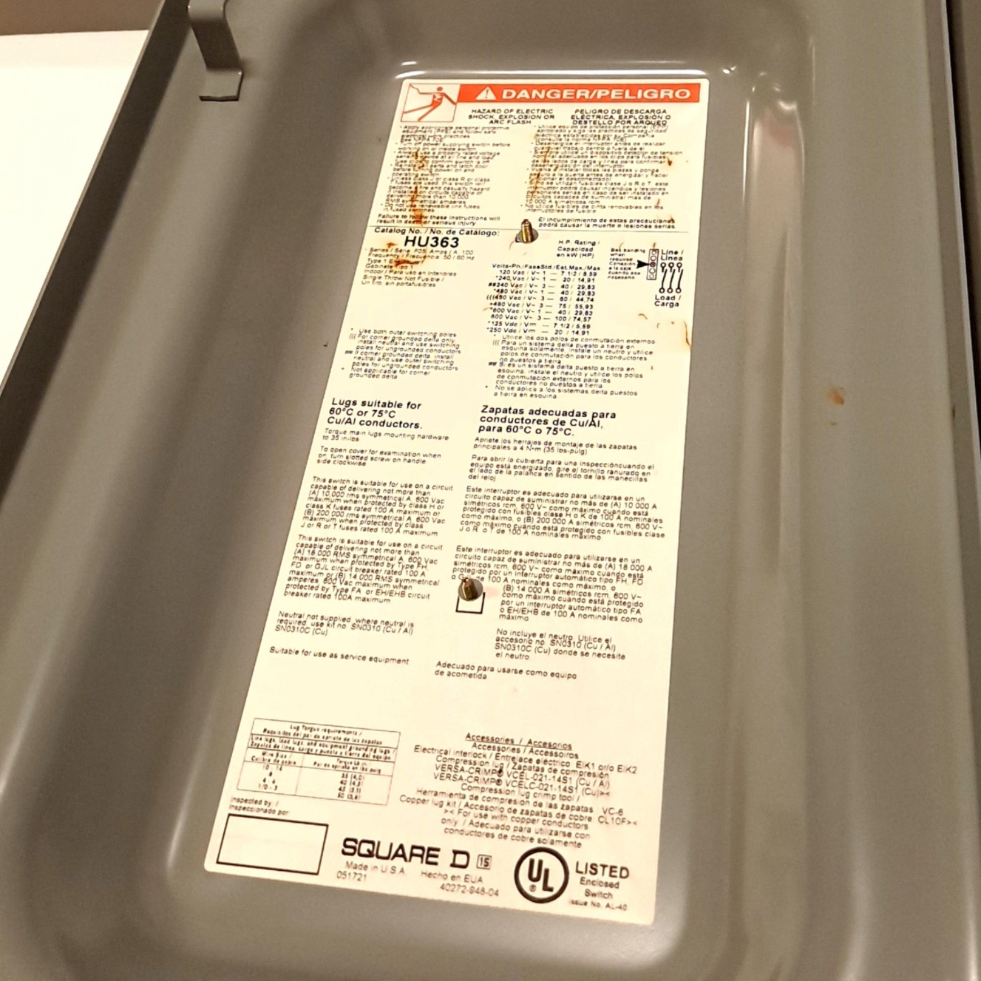 New Square D HU363 Safety switch W/ Enclosure,100A, 3 poles, 100hp, 600VAC/DC