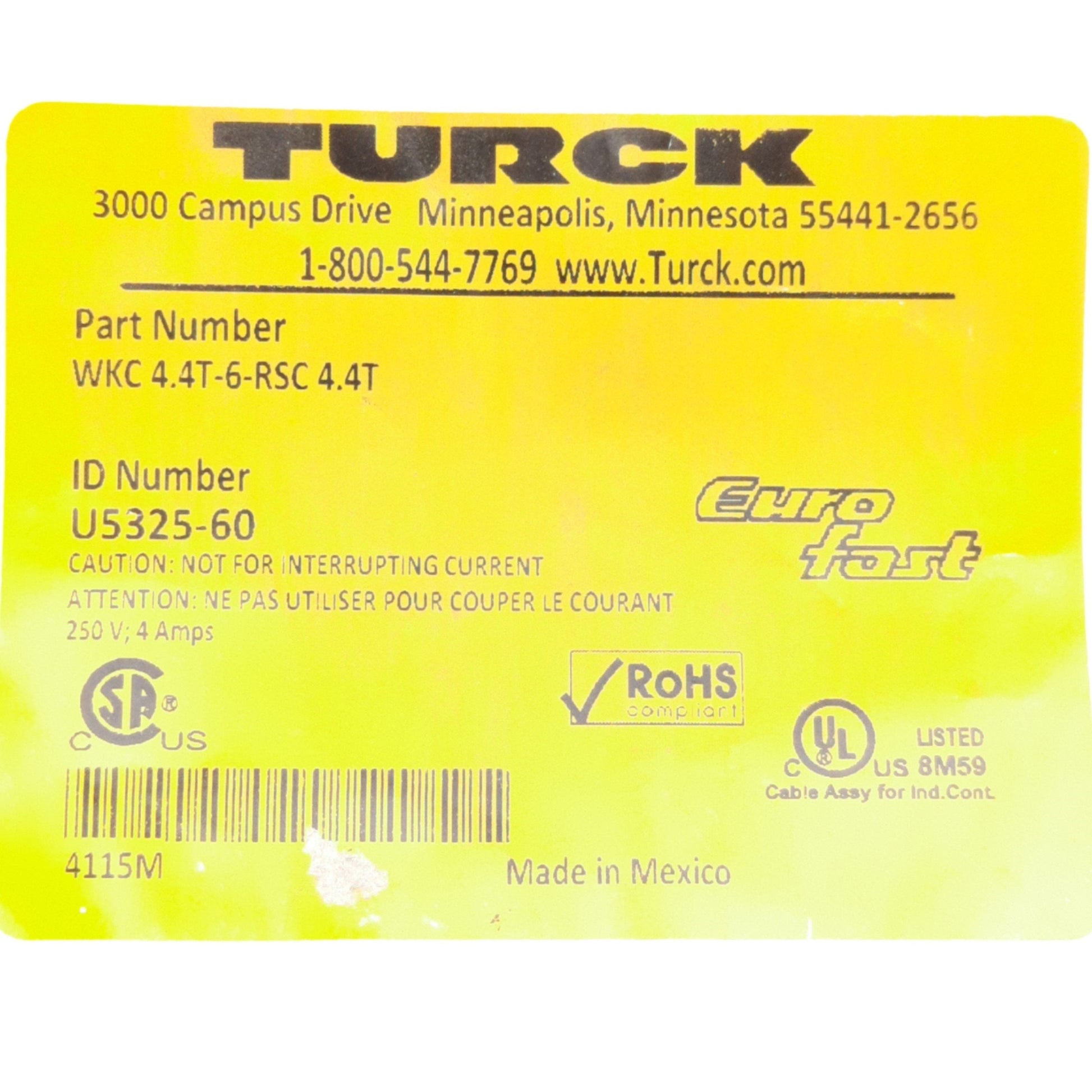 New Turck WKC 4.4T-6-RSC 4.4T Cordset, M12 4-Pin M/F, 6 Meters, 250VAC/DC 4A