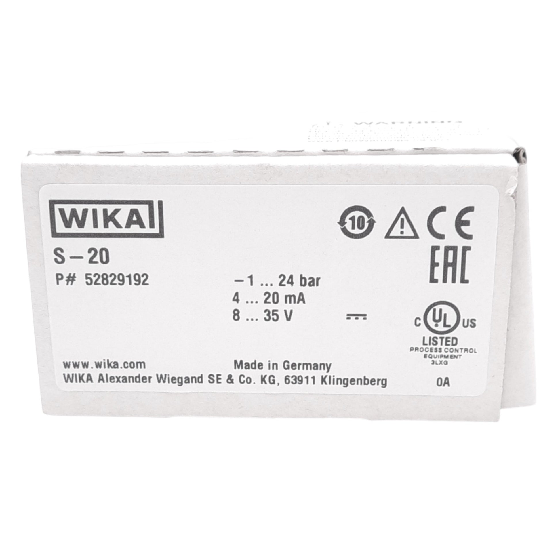 New Wika S-20 Pressure Transmitter, -1...24bar, 4-20mA, 8-35VDC, 1/2NPT, 1480bar Max
