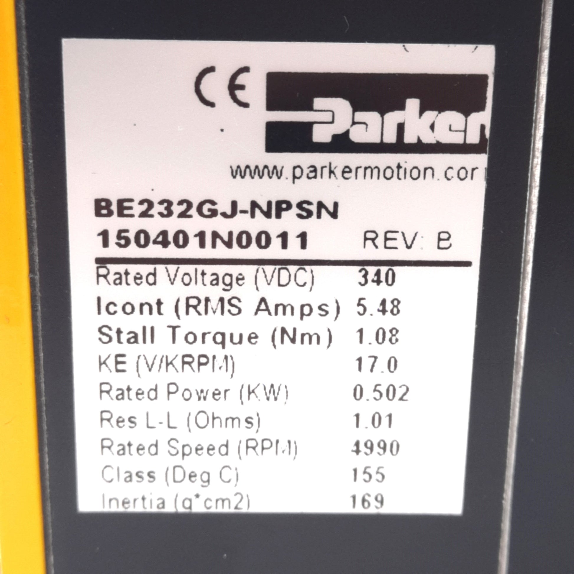 Used Parker BE232GJ-NPSN Servo Motor 340VDC 5.48A, 1.08Nm, 0.502kW, 4990rpm, NEMA 23