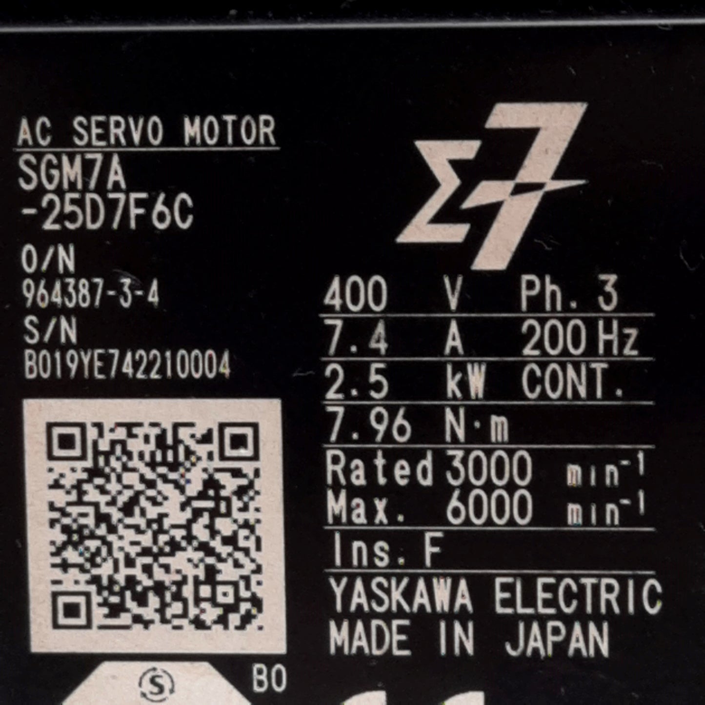 Item Condition: Used SKU: SB-183509 RT-3-B From our inventory we are selling a Sigma-7 SGM7A-25D7F6C AC Servo Motor, 400V 2.5kW, 7.96Nm, 6000rpm, ø24mm Shaft. Specifications: