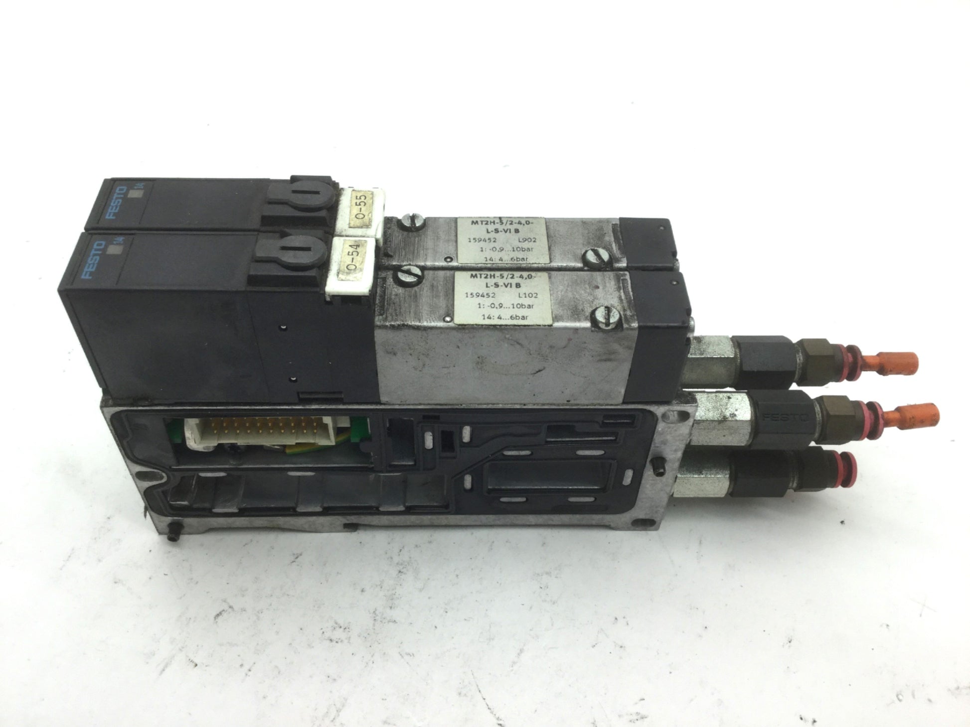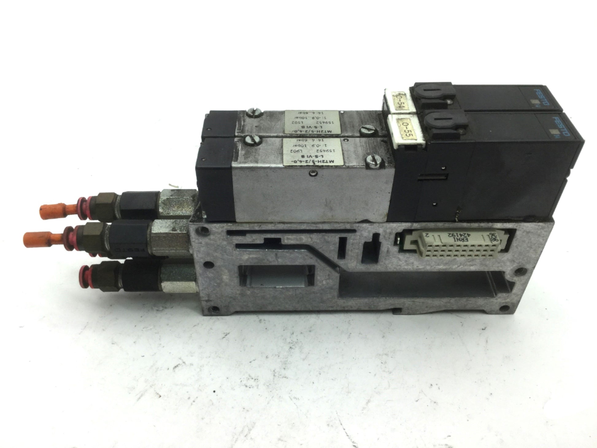 Used 2x Festo MT2H-5/2-4.0-L-S-VI Solenoid Valves On Festo VIGM-03-4.0 Manifold Block