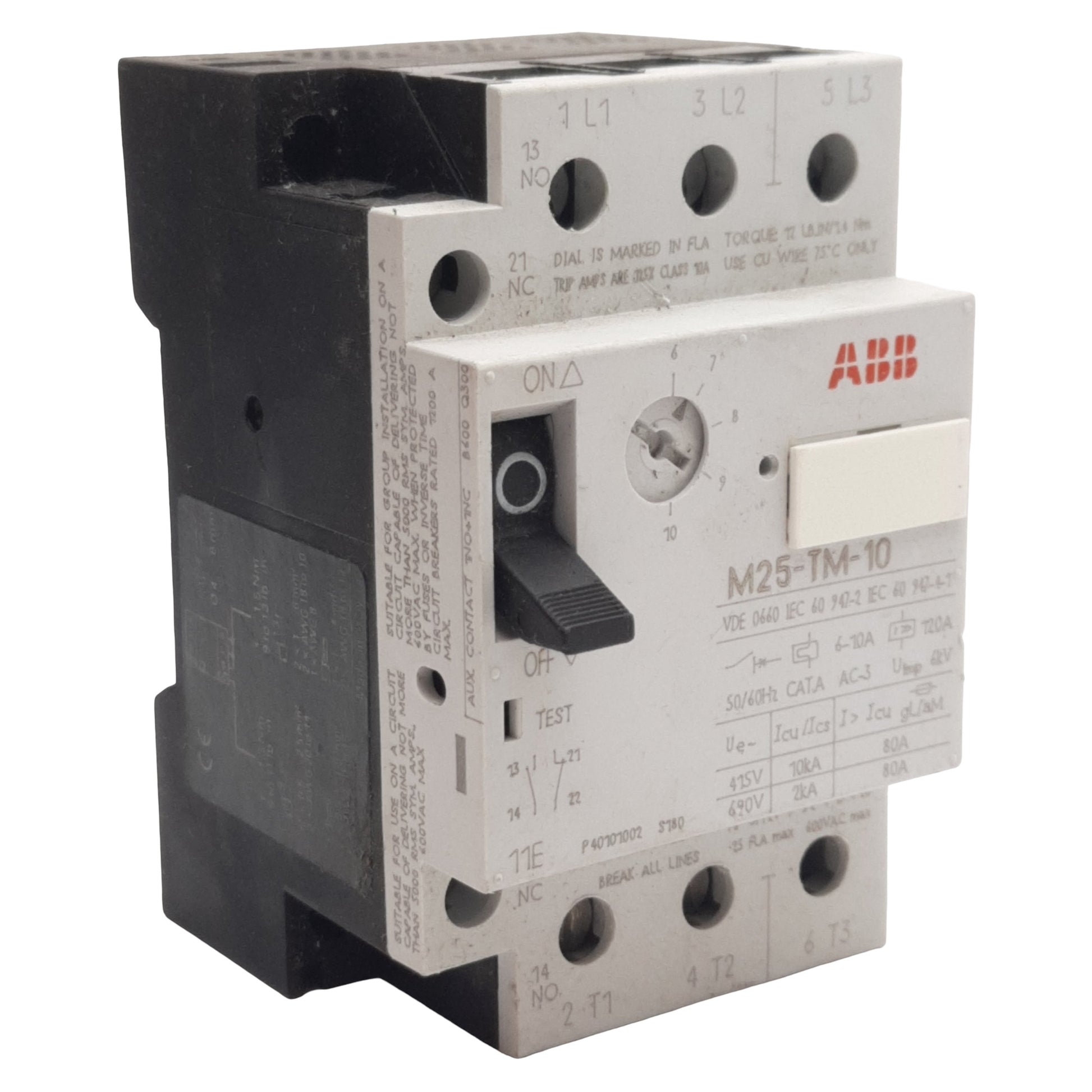 Used ABB M25-TM-10 Motor Protection Circuit Breaker, 3-Pole, 1N.O. + 1N.C., 6-10A