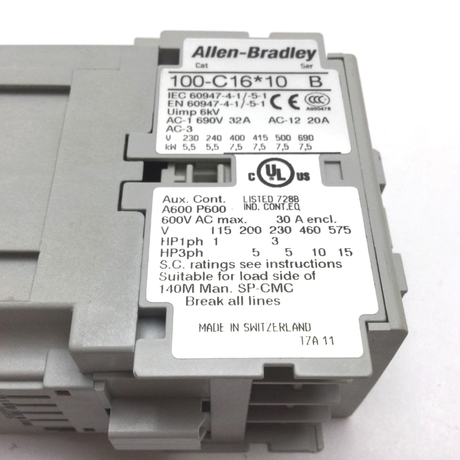 | Item Condition: Used SKU: SB-152216 ST43-5-C From our inventory we are selling an Allen Bradley 100-C16*10 Contactor, 3-Pole W/ N/O Aux, Coil: 230VAC, 600VAC 30A. Specifications: