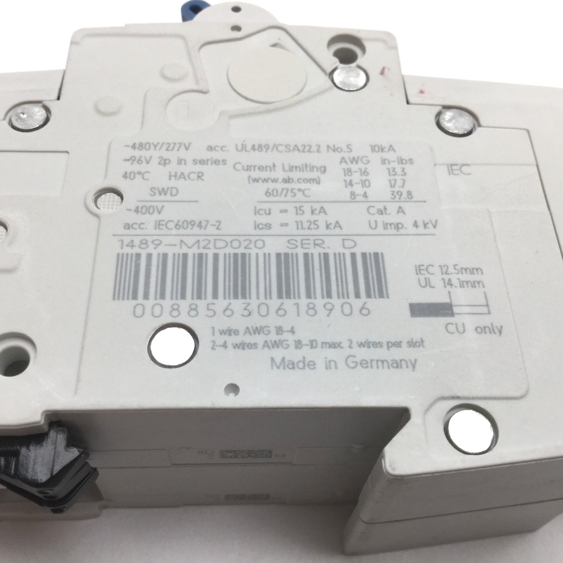 Used Allen Bradley 1489-M2D020 Circuit Breaker, 2-Pole, D-Curve, 2A 480Y/277VAC