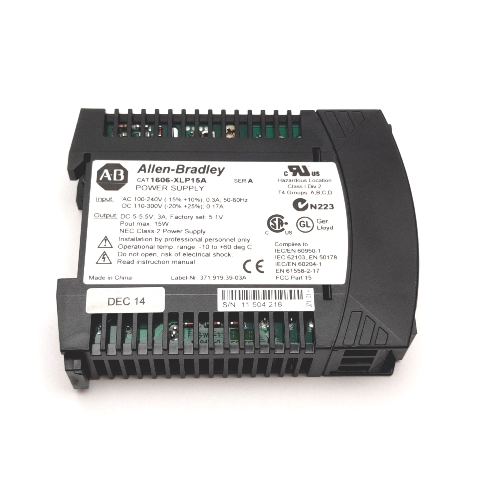 | Item Condition: Used SKU: SB-168911 ST12-3-L From our inventory we are selling a Allen Bradley 1606-XLP15A Power Supply, Input: 100-240VAC, Output: 5-5.5VDC 15W. Specifications: