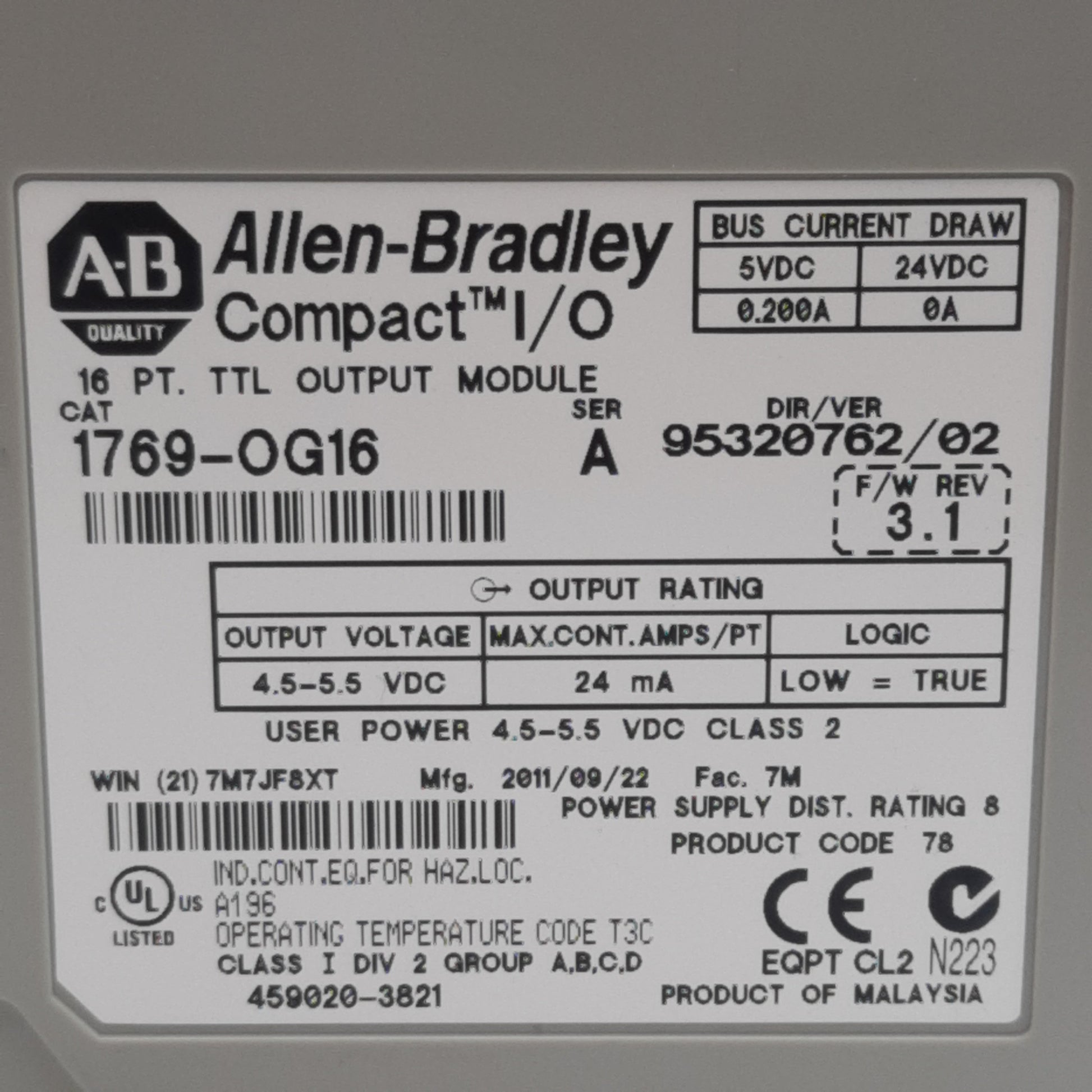 Used Allen Bradley 1769-OG16 Compact Output Module TTL, 16 Channel, 4.5-5.5VDC Out